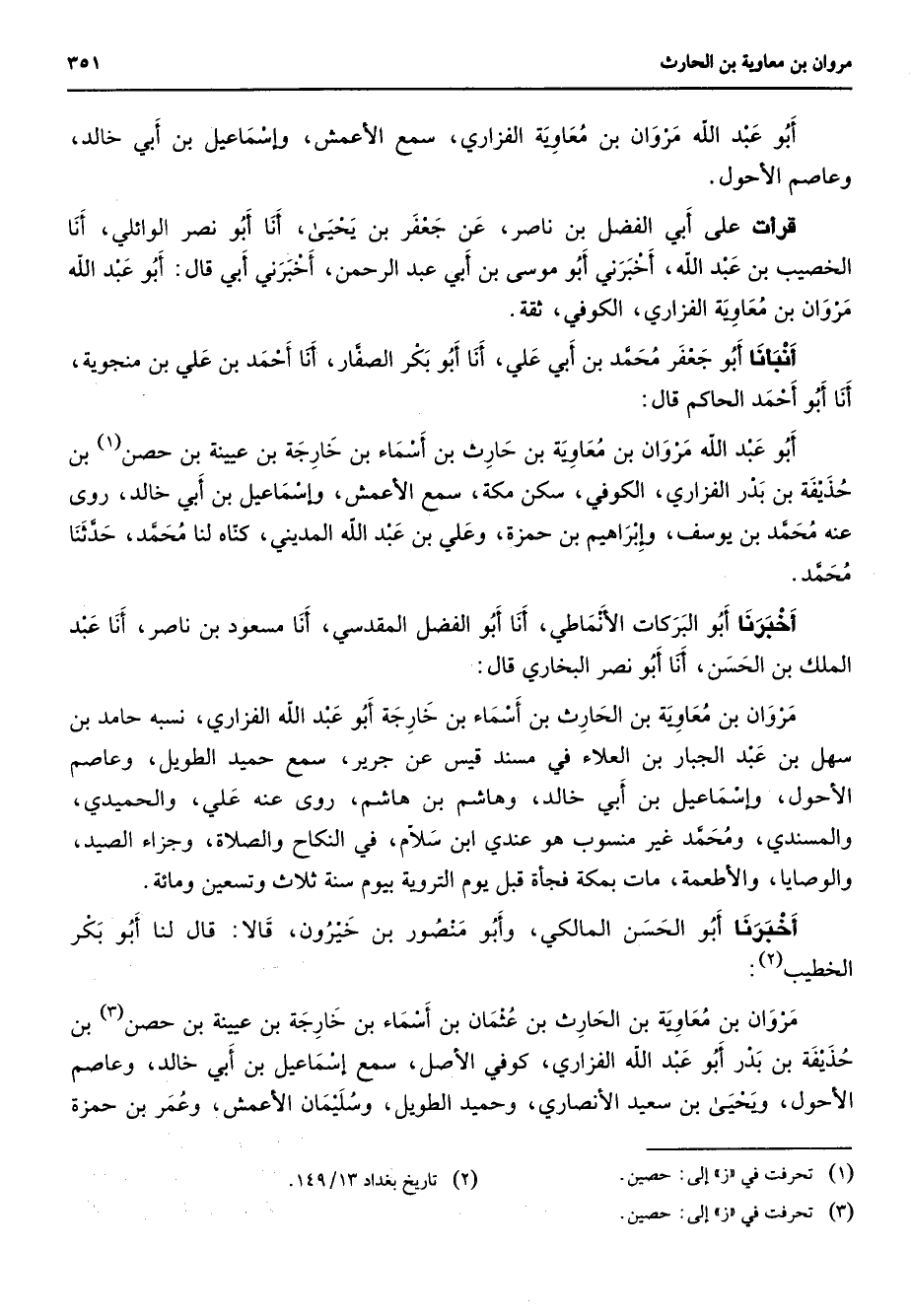 أبو عبد الله مروان بن معاوية الفزاري سمع الأعمش وإسماعيل بن أبي خالد وعاصم الأحول قرأت على أبي الفضل بن ناصر عن جعفر بن يحيى أنا أبو نصر الوائلي أنا الخصيب بن عبد الله أخبرني أبو موسى بن أبي عبد الرحمن أخبرني أبي قال أبو عبد الله مروان بن معاوية الفزاري الكوفي ثقة أنبأنا أبو جعفر محمد بن أبي علي أنا أبو بكر الصفار أنا أحمد بن علي بن منجوية أنا أبو أحمد الحاكم قال أبو عبد الله مروان بن معاوية بن حارث بن أسماء بن خارجة بن عيينة بن حصن (1) بن حذيفة بن بدر الفزاري الكوفي سكن مكة سمع الأعمش وإسماعيل بن أبي خالد روى عنه محمد بن يوسف وإبراهيم بن حمزة وعلي بن عبد الله المديني كناه لنا محمد حدثنا محمد أخبرنا أبو البركات الأنماطي أنا أبو الفضل المقدسي أنا مسعود بن ناصر أنا عبد الملك بن الحسن أنا أبو نصر البخاري قال مروان بن معاوية بن الحارث بن أسماء بن خارجة أبو عبد الله الفزاري نسبه حامد بن سهل بن عبد الجبار بن العلاء في مسند قيس عن جرير سمع حميد الطويل وعاصم الأحول وإسماعيل بن أبي خالد وهاشم بن هاشم روى عنه علي والحميدي والمسندي ومحمد غير منسوب هو عندي ابن سلام في النكاح والصلاة وجزاء الصيد والوصايا والأطعمة مات بمكة فجأة قبل يوم التروية بيوم سنة ثلاث وتسعين ومائة أخبرنا أبو الحسن المالكي وأبو منصور بن خيرون قالا قال لنا أبو بكر الخطيب (2) مروان بن معاوية بن الحارث بن أسماء بن خارجة بن عيينة بن حصن (3) بن حذيفة بن بدر أبو عبد الله الفزاري كوفي الأصل سمع إسماعيل بن أبي خالد وعاصم الأحول ويحيى بن سعيد الأنصاري وحميد الطويل وسليمان الأعمش وعمر بن حمزة