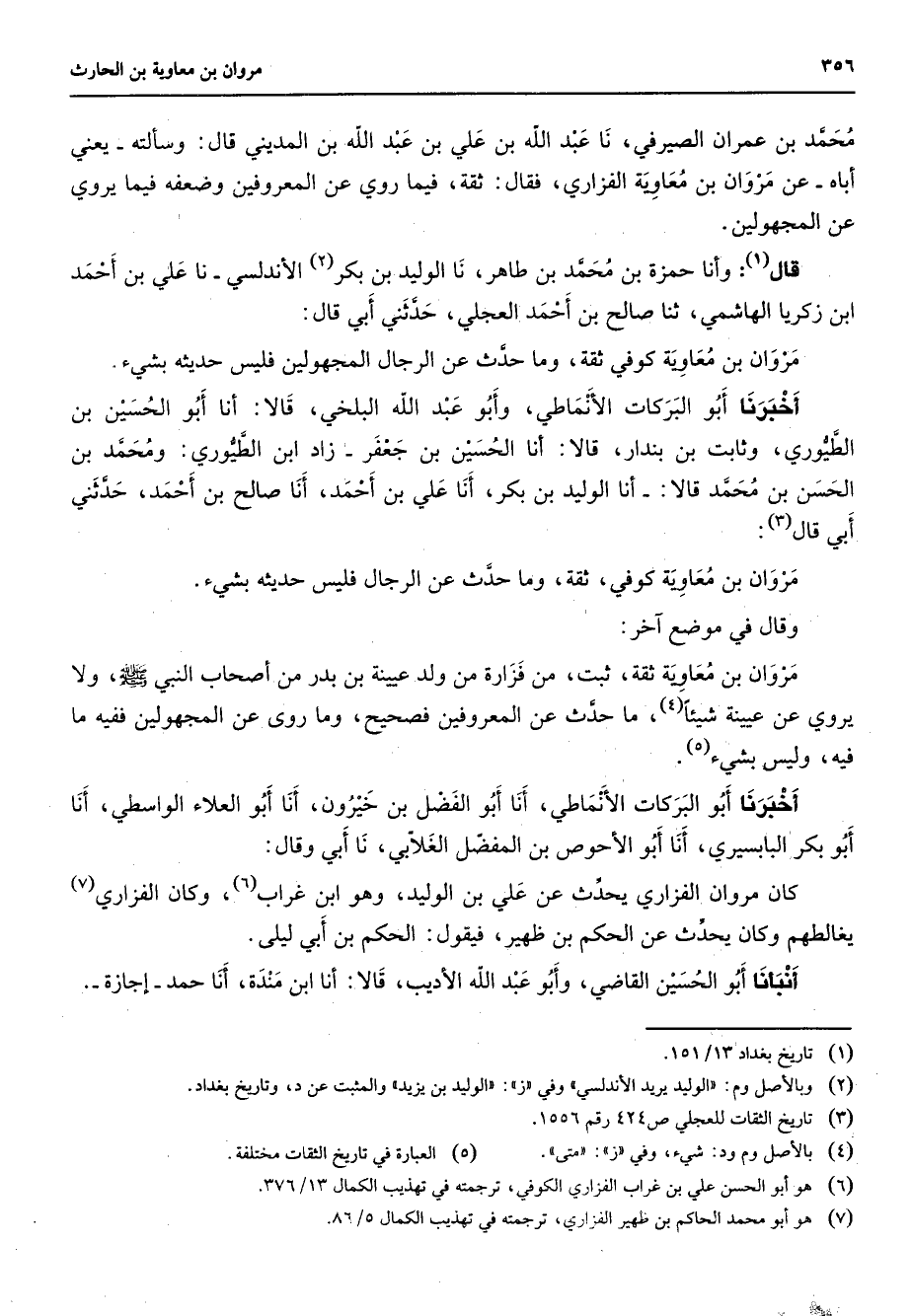 محمد بن عمران الصيرفي نا عبد الله بن علي بن عبد الله بن المديني قال وسألته يعني أباه عن مروان بن معاوية الفزاري فقال ثقة فيما روي عن المعروفين وضعفه فيما يروي عن المجهولين قال (1) وأنا حمزة بن محمد بن طاهر نا الوليد بن بكر (2) الأندلسي نا علي بن أحمد ابن زكريا الهاشمي ثنا صالح بن أحمد العجلي حدثني أبي قال مروان بن معاوية كوفي ثقة وما حدث عن الرجال المجهولين فليس حديثه بشئ أخبرنا أبو البركات الأنماطي وأبو عبد الله البلخي قالا أنا أبو الحسين بن الطيوري وثابت بن بندار قالا أنا الحسين بن جعفر زاد ابن الطيوري ومحمد بن الحسن بن محمد قالا أنا الوليد بن بكر أنا علي بن أحمد أنا صالح بن أحمد حدثني أبي قال (3) مروان بن معاوية كوفي ثقة وما حدث عن الرجال فليس حديثه بشئ وقال في موضع آخر مروان بن معاوية ثقة ثبت من فزارة من ولد عيينة بن بدر من أصحاب النبي (صلى الله عليه وسلم) ولا يروي عن عيينة شيئا (4) ما حدث عن المعروفين فصحيح وما روى عن المجهولين ففيه ما فيه وليس بشئ (5) أخبرنا أبو البركات الأنماطي أنا أبو الفضل بن خيرون أنا أبو العلاء الواسطي أنا أبو بكر البابسيري أنا أبو الأحوص بن المفضل الغلابي نا أبي وقال كان مروان الفزاري يحدث عن علي بن الوليد وهو ابن غراب (6) وكان الفزاري (7) يغالطهم وكان يحدث عن الحكم بن ظهير فيقول الحكم بن أبي ليلى أنبأنا أبو الحسين القاضي وأبو عبد الله الأديب قالا أنا ابن مندة أنا حمد إجازة