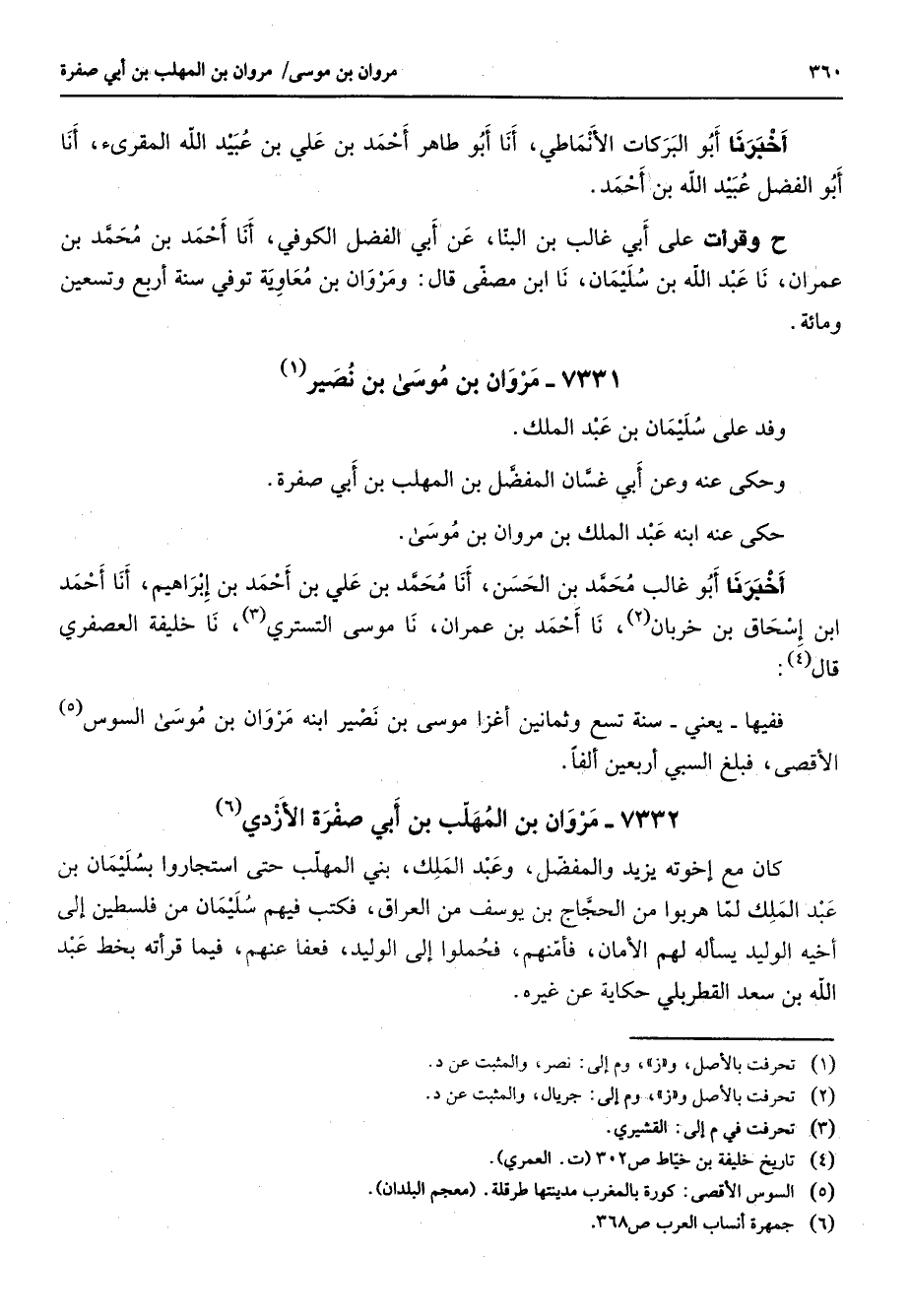 7331 - مروان بن موسى بن نصير (1) وفد على سليمان بن عبد الملك وحكى عنه وعن أبي غسان المفضل بن المهلب بن أبي صفرة حكى عنه ابنه عبد الملك بن مروان بن موسى أخبرنا أبو غالب محمد بن الحسن أنا محمد بن علي بن أحمد بن إبراهيم أنا أحمد ابن إسحاق بن خربان (2) نا أحمد بن عمران نا موسى التستري (3) نا خليفة العصفري قال (4) ففيها يعني سنة تسع وثمانين أغزا موسى بن نصير ابنه مروان بن موسى السوس (5) الأقصى فبلغ السبي أربعين ألفا