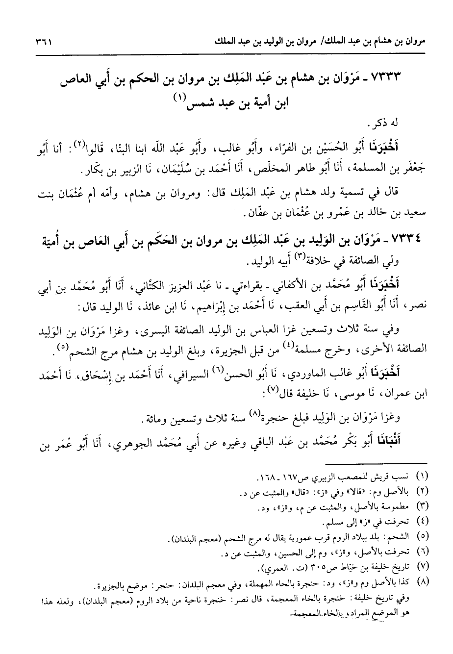 7333 - مروان بن هشام بن عبد الملك بن مروان بن الحكم بن أبي العاص ابن أمية بن عبد شمس (1) له ذكر أخبرنا أبو الحسين بن الفراء وأبو غالب وأبو عبد الله ابنا البنا قالوا (2) أنا أبو جعفر بن المسلمة أنا أبو طاهر المخلص أنا أحمد بن سليمان نا الزبير بن بكار قال في تسمية ولد هشام بن عبد الملك قال ومروان بن هشام وأمه أم عثمان بنت سعيد بن خالد بن عمرو بن عثمان بن عفان