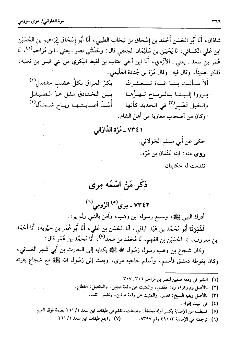7342 - مرى (5) الرومي (6) أدرك النبي (صلى الله عليه وسلم) وسمع رسوله ابن وهب وآمن بالنبي ولم يره أخبرنا أبو محمد بن عبد الباقي أنا الحسن بن علي أنا أبو عمر بن حيوية أنا أحمد بن معروف نا الحسين بن الفهم نا محمد بن سعد (7) أنا محمد بن عمر قال وكان شجاع بن وهب رسول رسول الله (صلى الله عليه وسلم) بكتابه إلى الحارث بن أبي شمر الغساني وكان بغوطة دمشق فأسلم واسلم حاجبه مرى وبعث إلى رسول الله (صلى الله عليه وسلم) مع شجاع يقرئه