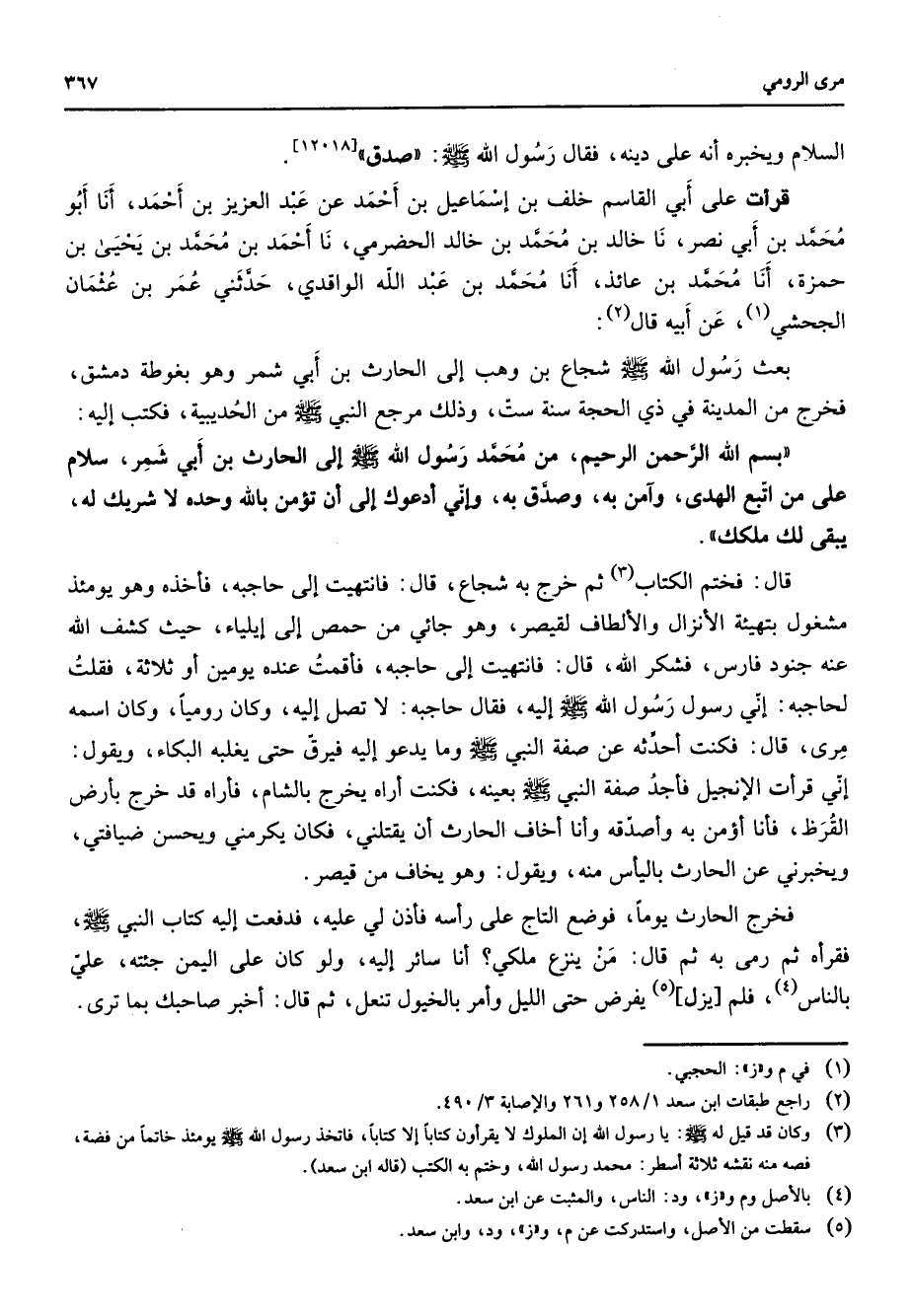 السلام ويخبره أنه على دينه فقال رسول الله (صلى الله عليه وسلم) صدق قرأت على أبي القاسم خلف بن إسماعيل بن أحمد عن عبد العزيز بن أحمد أنا أبو محمد بن ابي نصر نا خالد بن محمد بن خالد الحضرمي نا أحمد بن محمد بن يحيى بن حمزة أنا محمد بن عائذ أنا محمد بن عبد الله الواقدي حدثني عمر بن عثمان الجحشي (1) عن ابيه قال (2) بعث رسول الله (صلى الله عليه وسلم) شجاع بن وهب إلى الحارث بن أبي شمر وهو بغوطة دمشق فخرج من المدينة في ذي الحجة سنة ست وذلك مرجع النبي (صلى الله عليه وسلم) من الحديبية فكتب إليه بسم الله الرحمن الرحيم من محمد رسول الله (صلى الله عليه وسلم) إلى الحارث بن أبي شمر سلام على من اتبع الهدى وآمن به وصدق به وإني أدعوك إلا أن تؤمن بالله وحده لا شريك له يبقي لك ملكك قال فختم الكتاب (3) ثم خرج به شجاع قال فانتهيت إلى حاجبه فأخذه وهو يومئذ مشغول بتهيئة الأنزال والألطاف لقيصر وهو جائي من حمص إلى إيلياء حيث كشف الله عنه جنود فارس فشكر الله قال فانتهيت إلى حاجبه فأقمت عنده يومين أو ثلاثة فقلت لحاجبة إني رسول رسول الله (صلى الله عليه وسلم) إليه فقال حاجبه لا تصل إليه وكان روميا وكان اسمه مرى قال فكنت أحدثه عن صفة النبي (صلى الله عليه وسلم) وما يدعوا إليه فيرق حتى يغلبه البكاء ويقول إني قرأت الإنجيل فأجد صفة النبي (صلى الله عليه وسلم) بعينه فكنت أراه يخرج بالشام فاراه قد خرج بأرض القرظ فأنا أؤمن به وأصدقه وأنا أخاف الحارث أن يقتلني فكان يكرمني ويحسن ضيافتي ويخبرني عن الحارث بالياس منه ويقول وهو يخاف من قيصر فخرج الحارث يوما فوضع التاج على رأسه فأذن لي عليه فدفعت إليه كتاب النبي (صلى الله عليه وسلم) فقرأه ثم رمى به ثم قال من ينزع ملكي أنا سائر إليه ولو كان على اليمن جئته علي بالناس (4) فلم يزل (5) يفرض حتى الليل وأمر بالخيول تنعل ثم قال أخبر صاحبك بما ترى
