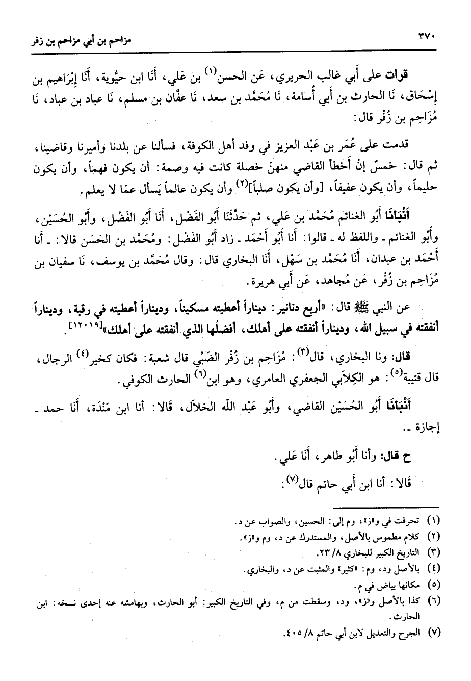 قرأت على أبي غالب الحريري عن الحسن (1) بن علي أنا ابن حيوية أنا إبراهيم بن إسحاق نا الحارث بن أبي أسامة نا محمد بن سعد نا عفان بن مسلم نا عباد بن عباد نا مزاحم بن زفر قال قدمت على عمر بن عبد العزيز في وفد أهل الكوفة فسألنا عن بلدنا وأميرنا وقاضينا ثم قال خمس إن أخطأ القاضي منهن خصلة كانت فيه وصمة أن يكون فهما وأن يكون حليما وأن يكون عفيفا وأن يكون صلبا (2) وأن يكون عالما يسال عما لا يعلم أنبأنا أبو الغنائم محمد بن علي ثم حدثنا أبو الفضل أنا أبو الفضل وأبو الحسين وأبو الغنائم واللفظ له قالوا أنا أبو أحمد زاد أبو الفضل ومحمد بن الحسن قالا أنا أحمد بن عبدان أنا محمد بن سهل أنا البخاري قال وقال محمد بن يوسف نا سفيان بن مزاحم بن زفر عن مجاهد عن أبي هريرة عن النبي (صلى الله عليه وسلم) قال أربع دنانير دينارا أعطيته مسكينا ودينارا أعطيته في رقبة ودينارا أنفقته في سبيل الله ودينارا أنفقته على أهلك أفضلها الذي أنفقته على أهلك قال ونا البخاري قال (3) مزاحم بن زفر الضبي قال شعبة فكان كخير (4) الرجال قال قتيبة (5) هو الكلابي الجعفري العامري وهو ابن (6) الحارث الكوفي أنبأنا أبو الحسين القاضي وأبو عبد الله الخلال قالا أنا ابن مندة أنا حمد إجازة ح قال وأنا أبو طاهر أنا علي قالا أنا ابن أبي حاتم قال (7)