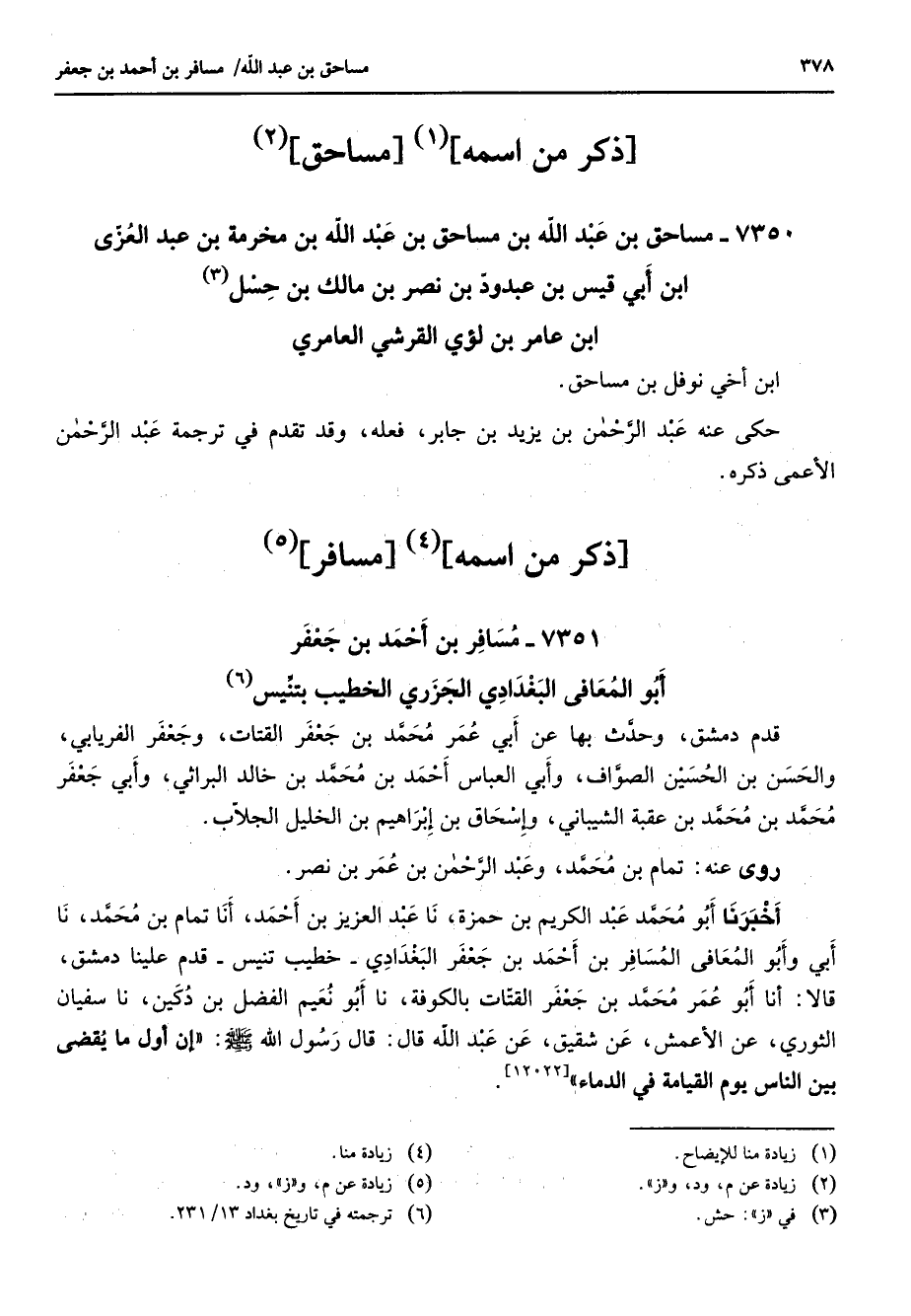 7350 - مساحق بن عبد الله بن مساحق بن عبد الله بن مخرمة بن عبد العزى ابن أبي قيس بن عبدود بن نصر بن مالك بن حسل (3) ابن عامر بن لؤي القرشي العامري ابن أخي نوفل بن مساحق حكى عنه عبد الرحمن بن يزيد بن جابر فعله وقد تقدم في ترجمة عبد الرحمن الأعمى ذكره / ذكر من اسمه (4) مسافر / (5)