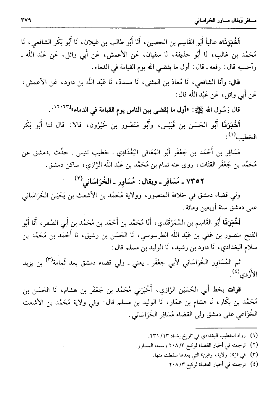 7352 - مسافر ويقال مساور الخراساني (2) ولي قضاء دمشق في خلافة المنصور وولاية محمد بن الأشعث بن يحيى الخراساني على دمشق سنة أربعين ومائة أخبرنا أبو القاسم بن السمرقندي أنا محمد بن أحمد بن محمد بن أبي الصقر أنا أبو الفتح منصور بن علي بن عبد الله الطرسوسي نا الحسن بن رشيق نا أحمد بن محمد بن سلام البغدادي نا داود بن رشيد نا الوليد بن مسلم قال ثم المساور الخراساني لأبي جعفر يعني ولي قضاء دمشق بعد ثمامة (3) بن يزيد الأزدي (4) قرأت بخط أبي الحسين الرازي أخبرني محمد بن جعفر بن هشام نا الحسن بن محمد بن بكار نا هشام بن عمار نا الوليد بن مسلم قال وفي ولاية محمد بن الأشعث الخزاعي على دمشق ولى القضاء مسافر الخراساني