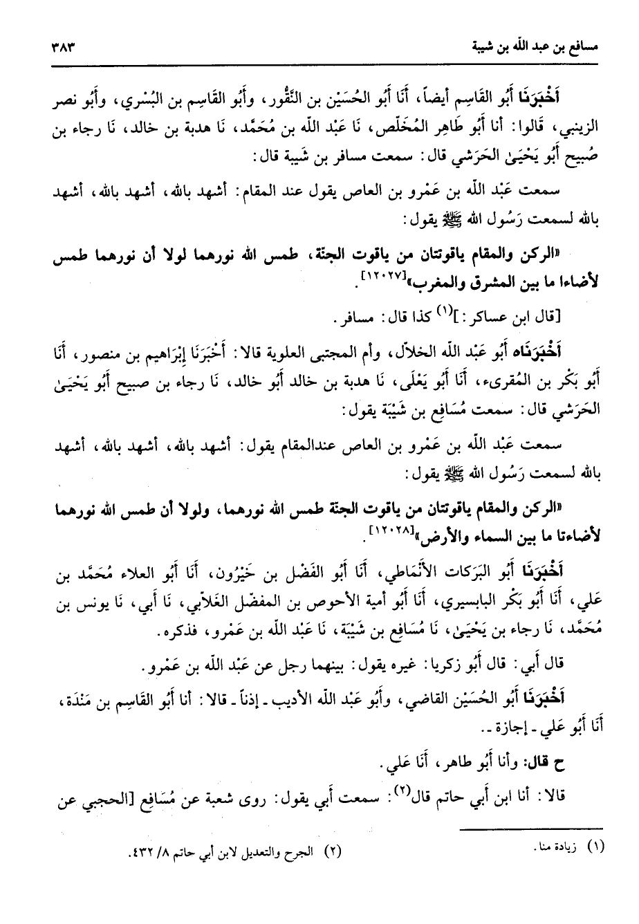 أخبرنا أبو القاسم أيضا أنا أبو الحسين بن النقور وأبو القاسم بن البسري وأبو نصر الزينبي قالوا أنا أبو طاهر المخلص نا عبد الله بن محمد نا هدبة بن خالد نا رجاء بن صبيح أبو يحيى الحرشي قال سمعت مسافر بن شيبة قال سمعت عبد الله بن عمرو بن العاص يقول عند المقام أشهد بالله أشهد بالله أشهد بالله سمعت رسول الله (صلى الله عليه وسلم) يقول الركن والمقام ياقوتتان من ياقوت الجنة طمس الله نورهما لولا أن نورهما طمس لأضاءا ما بين المشرق والمغرب قال ابن عساكر (1) كذا قال مسافر أخبرناه أبو عبد الله الخلال وأم المجتبى العلوية قالا أخبرنا إبراهيم بن منصور أنا أبو بكر بن المقرئ أنا أبو يعلى نا هدبة بن خالد أبو خالد نا رجاء بن صبيح أبو يحيى الحرشي قال سمعت مسافع بن شيبة يقول سمعت عبد الله بن عمرو بن العاص عند المقام يقول أشهد بالله أشهد بالله أشهد بالله سمعت رسول الله (صلى الله عليه وسلم) يقول الركن والمقام ياقوتتان من ياقوت الجنة طمس الله نورهما ولولا أن طمس الله نورهما لأضاءتا ما بين السماء والأرض أخبرنا أبو البركات الأنماطي أنا أبو الفضل بن خيرون أنا أبو العلاء محمد بن علي أنا أبو بكر البابسيري أنا أبو أمية الأحوص بن المفضل الغلابي نا أبي نا يونس بن محمد نا رجاء بن يحيى نا مسافع بن شيبة نا عبد الله بن عمرو فذكره قال أبي قال أبو زكريا غيره يقول بينهما رجل عن عبد الله بن عمرو أخبرنا أبو الحسين القاضي وأبو عبد الله الأديب إذنا قالا أنا أبو القاسم بن مندة أنا أبو علي إجازة ح قال وأنا أبو طاهر أنا علي قالا أنا ابن أبي حاتم قال (2) سمعت أبي يقول روى شعبة عن مسافع الحجبي عن