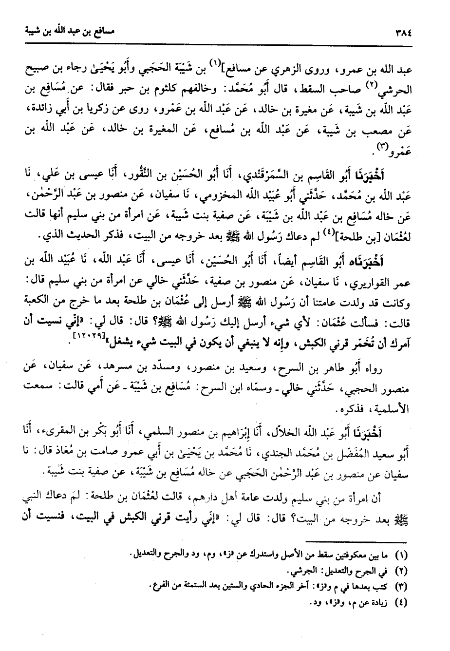 عبد الله بن عمرو وروى الزهري عن مسافع (1) بن شيبة الحجبي وأبو يحيى رجاء بن صبيح الحرشي (2) صاحب السقط قال أبو محمد وخالفهم كلثوم بن حبر فقال عن مسافع بن عبد الله بن شيبة عن مغيرة بن خالد عن عبد الله بن عمرو روى عن زكريا بن ابي زائدة عن مصعب بن شيبة عن عبد الله بن مسافع عن المغيرة بن خالد عن عبد الله بن عمرو (3) أخبرنا أبو القاسم بن السمرقندي أنا أبو الحسين بن النقور أنا عيسى بن علي نا عبد الله بن محمد حدثني أبو عبيد الله المخزومي نا سفيان عن منصور بن عبد الرحمن عن خاله مسافع بن عبد الله بن شيبة عن صفية بنت شيبة عن امرأة من بني سليم أنها قالت لعثمان بن طلحة (4) لم دعاك رسول الله (صلى الله عليه وسلم) بعد خروجه من البيت فذكر الحديث الذي أخبرناه أبو القاسم أيضا أنا أبو الحسين أنا عيسى أنا عبد الله نا عبيد الله بن عمر القواريري نا سفيان أنا منصور بن صفية حدثني خالي عن امرأة من بني سليم قال وكانت قد ولدت عامتنا أن رسول الله (صلى الله عليه وسلم) أرسل إلى عثمان بن طلحة بعد ما خرج من الكعبة قالت فسالت عثمان لأي شئ ارسل إليك رسول الله (صلى الله عليه وسلم) قال قال لي إني نسيت أن آمرك أن تخمر قرني الكبش وإنه لا ينبغي أن يكون في البيت شئ يشغل رواه أبو طاهر بن السرح وسعيد بن منصور ومسدد بن مسرهد عن سفيان عن منصور الحجبي حدثني خالي وسماه ابن السرح مسافع بن شيبة عن أمي قالت سمعت الأسلمية فذكره أخبرنا أبو عبد الله الخلال أنا إبراهيم بن منصور السلمي أنا أبو بكر بن المقرئ أنا أبو سعيد بن المفضل بن محمد الجندي نا محمد بن يحيى بن أبي عمرو صامت بن معاذ قال نا سفيان بن منصور بن عبد الرحمن الحجبي عن خاله مسافع بن شيبة عن صفية بنت شيبة أن امرأة من بني سليم ولدت عامة أهل دارهم قالت لعثمان بن طلحة لم دعاك النبي (صلى الله عليه وسلم) بعد خروجه من البيت قال قال لي إني رأيت قرني الكبش في البيت فنسيت أن