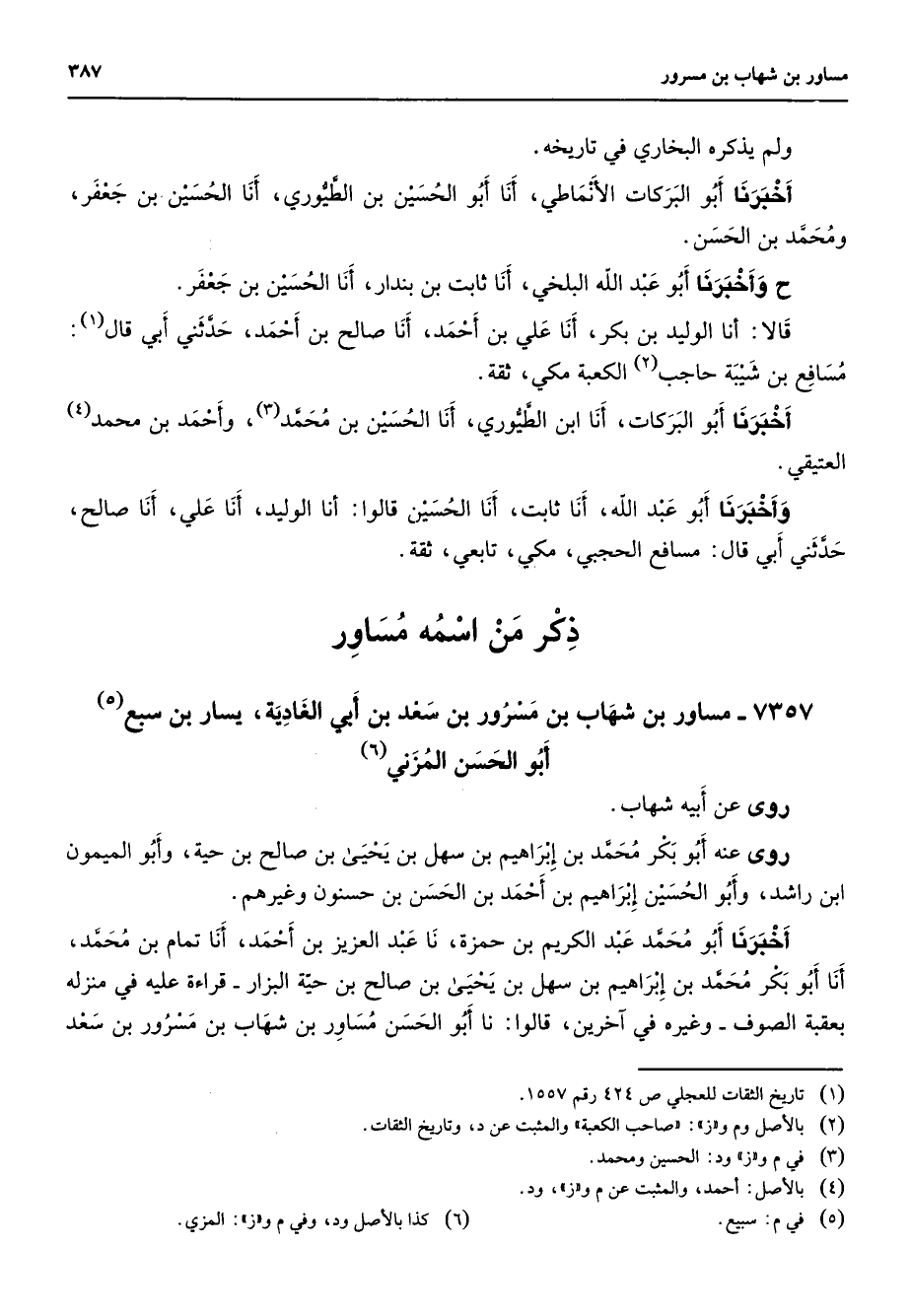 ولم يذكره البخاري في تاريخه أخبرنا أبو البركات الأنماطي أنا أبو الحسين بن الطيوري أنا الحسين بن جعفر ومحمد بن الحسن ح وأخبرنا أبو عبد الله البلخي أنا ثابت بن بندار أنا الحسين بن جعفر قالا أنا الوليد بن بكر أنا علي بن أحمد أنا صالح بن أحمد حدثني ابي قال (1) مسافع بن شيبة حاجب (2) الكعبة مكي ثقة أخبرنا أبو البركات أنا ابن الطيوري أنا الحسين بن محمد (3) وأحمد بن محمد (4) العتيقي وأخبرنا أبو عبد الله أنا ثابت أنا الحسين قالوا أنا الوليد أنا علي أنا صالح حدثني أبي قال مسافع الحجبي مكي تابعي ثقة / ذكر من اسمه مساور /