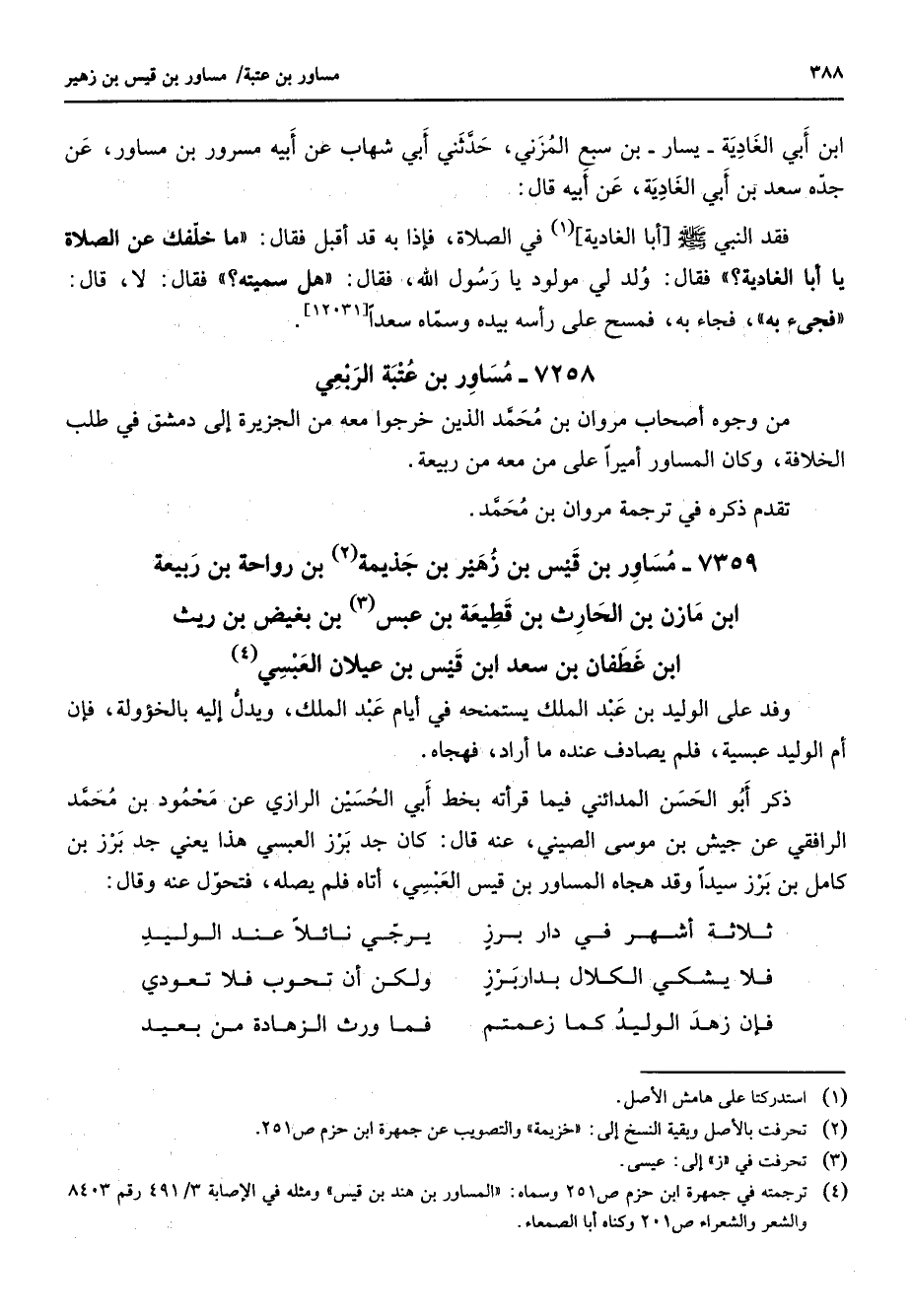 ابن أبي الغادية يسار بن سبع المزني حدثني أبي شهاب عن أبيه مسرور بن مساور عن جده سعد بن أبي الغادية عن أبيه قال فقد النبي (صلى الله عليه وسلم) أبا الغادية (1) في الصلاة فإذا به قد أقبل فقال ما خلفك عن الصلاة يا أبا الغادية فقال ولد لي مولود يا رسول الله فقال هل سميته فقال لا فقال فجئ به فجاء به فمسح على رأسه بيده وسماه سعدا 7258 مساور بن عتبة الربعي من وجوه أصحاب مروان بن محمد الذين خرجوا معه من الجزيرة إلى دمشق في طلب الخلافة وكان المساور أميرا على من معه من ربيعة تقدم ذكره في ترجمة مروان بن محمد 7359 مساور بن قيس بن زهير بن جذيمة (2) بن رواحة بن ربيعة ابن مازن بن الحارث بن قطيعة بن عبس (3) بن بغيض بن ريث ابن غطفان بن سعد ابن قيس بن عيلان العبسي (4) وفد على الوليد بن عبد الملك يستمنحه في أيام عبد الملك ويدل إليه بالخؤولة فإن أم الوليد عبسية فلم يصادف عنده ما أراد فهجاه ذكر أبو الحسن المدائني فيما قراته بخط أبي الحسين الرازي عن محمود بن محمد الرافقي عن جيش بن موسى الصيني عنه قال كان جد برز العبسي هذا يعني جد برز بن كامل بن برز سيدا وقد هجاه المساور بن قيس العبسي أتاه فلم يصله فتحول عنه وقال * ثلاثة أشهر في دار برز * يرجي نائلا عند الوليد فلا يشكي الكلال بدار برز * ولكن أن تحوب فلا تعودي فإن زهد الوليد كما زعمتم * فما ورث الزهادة من بعيد *
