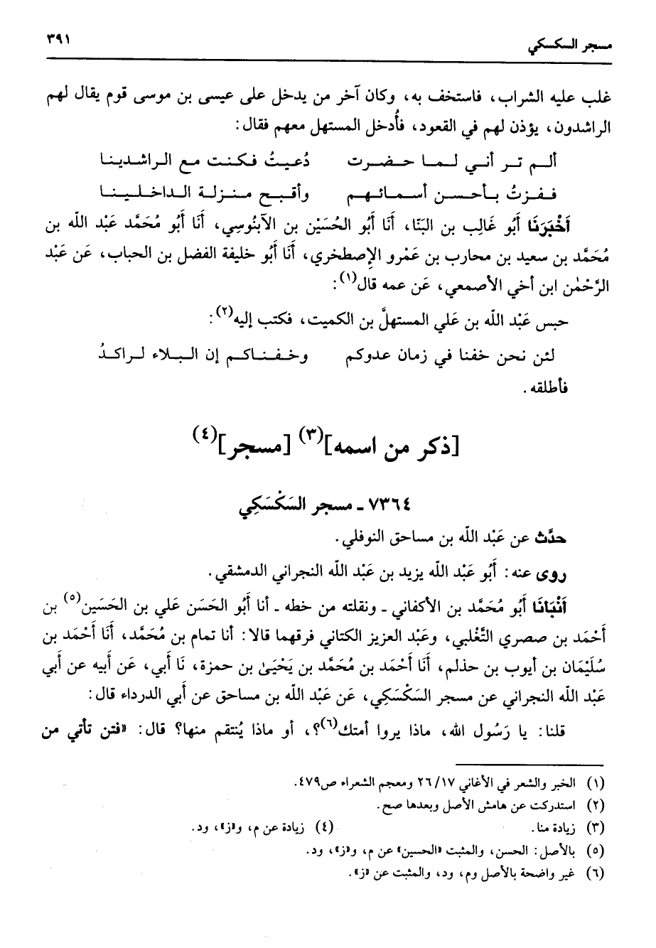 غلب عليه الشراب فاستخف به وكان آخر من يدخل على عيسى بن موسى قوم يقال لهم الراشدون يؤذن لهم في القعود فأدخل المستهل معهم فقال * ألم تر أني لما حضرت * دعيت فكنت مع الراشدينا ففزت بأحسن أسمائهم * وأقبح منزلة الداخلينا * أخبرنا أبو غالب بن البنا أنا أبو الحسين بن الآبنوسي أنا أبو محمد عبد الله بن محمد بن سعيد بن محارب بن عمرو الإصطخري أنا أبو خليفة الفضل بن الحباب عن عبد الرحمن ابن أخي الأصمعي عن عمه قال (1) حبس عبد الله بن علي المستهل بن الكميت فكتب إليه (2) * لئن نحن خفنا في زمان عدوكم * وخفناكم إن البلاء لراكد * فأطلقه / ذكر من اسمه (3) مسجر / (4)