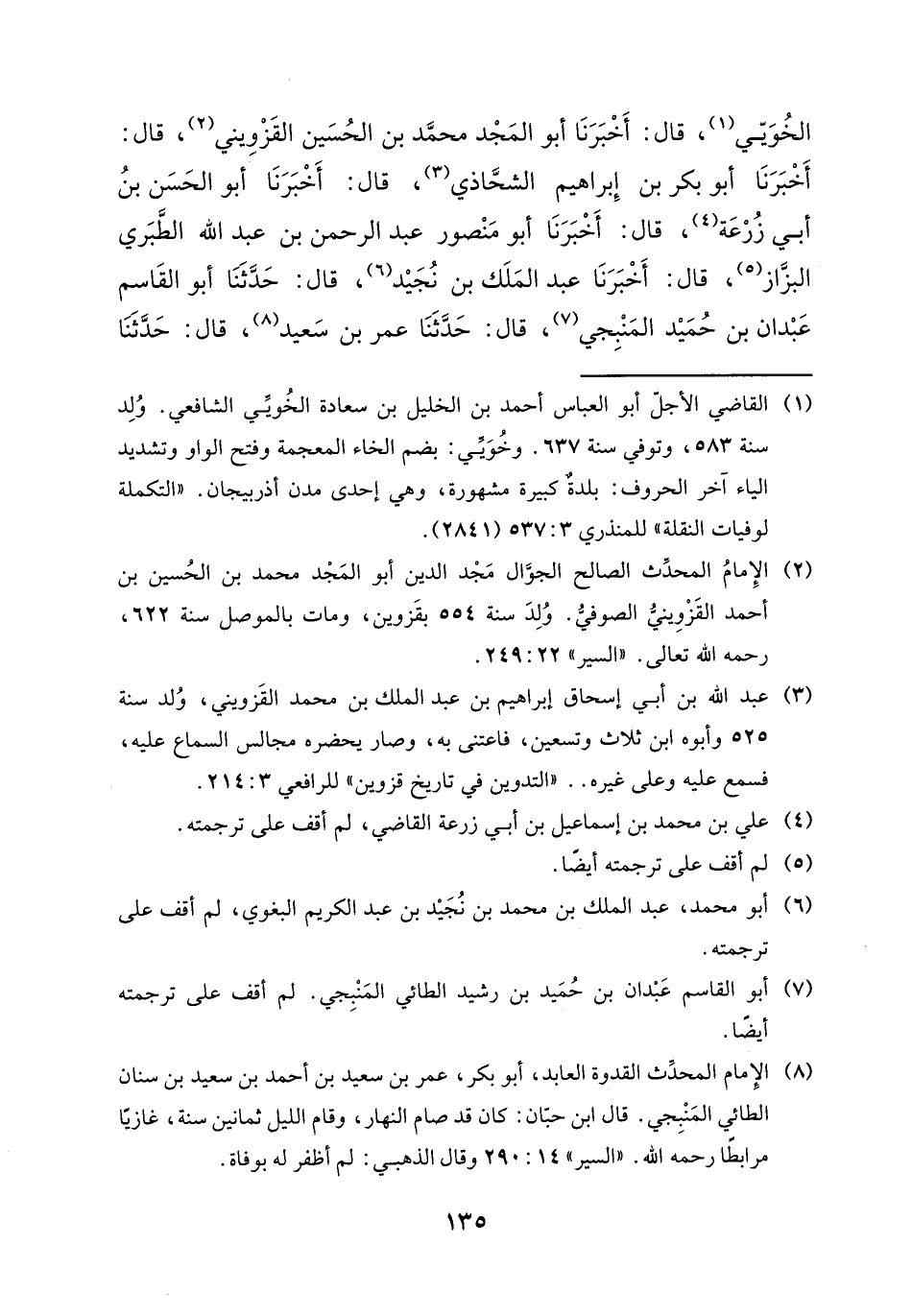 الْخُوَيِّيُّ، قَالَ: أَخْبَرَنَا أَبُو الْمَجْدِ مُحَمَّدُ بْنُ الْحُسَيْنِ الْقَزْوِينِيُّ، قَالَ: أَخْبَرَنَا أَبُو بَكْرِ بْنُ إِبْرَاهِيمَ الشَّحَّاذِيُّ، قَالَ: أَخْبَرَنَا أَبُو الْحَسَنِ بْنُ أَبِي زُرْعَةَ، قَالَ: أَخْبَرَنَا أَبُو مَنْصُورٍ عَبْدُ الرَّحْمَنِ بْنُ عَبْدِ اللَّهِ الطَّبَرِيُّ البَزَّازُ، قَالَ: أَخْبَرَنَا عَبْدُ الْمَلِكِ بْنُ نُجَيْدٍ، قَالَ: حَدَّثَنَا أَبُو الْقَاسِمِ عَبْدَانُ بْنُ حُمَيْدٍ الْمَنْبِجِيُّ، قَالَ: حَدَّثَنَا عُمَرُ بْنُ سَعِيدٍ، قَالَ: حَدَّثَنَا