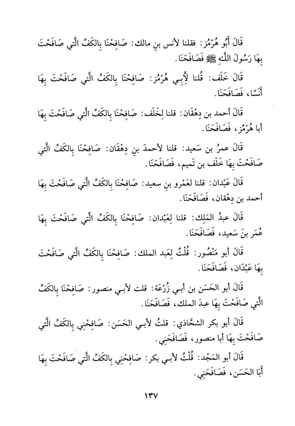 قَالَ: خَلَفٌ: قُلْنَا لأَبِي هُرْمُزَ: صَافِحْنَا بِالْكَفِّ الَّتِي صَافَحْتَ بِهَا أَنَسًا، فَصَافَحَنَا.