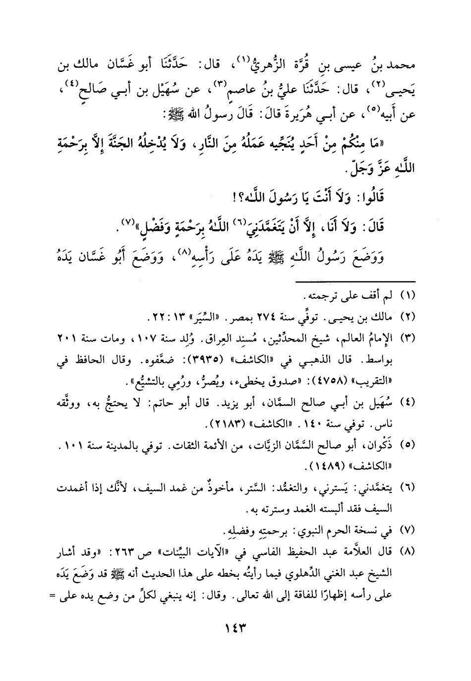 قَالُوا: وَلا أَنْتَ يَا رَسُولَ اللَّهِ؟ قَالَ: وَلا أَنَا، إِلا أَنْ يَتَغَمَّدَنِي اللَّهُ بِرَحْمَةٍ وَفَضْلٍ «.