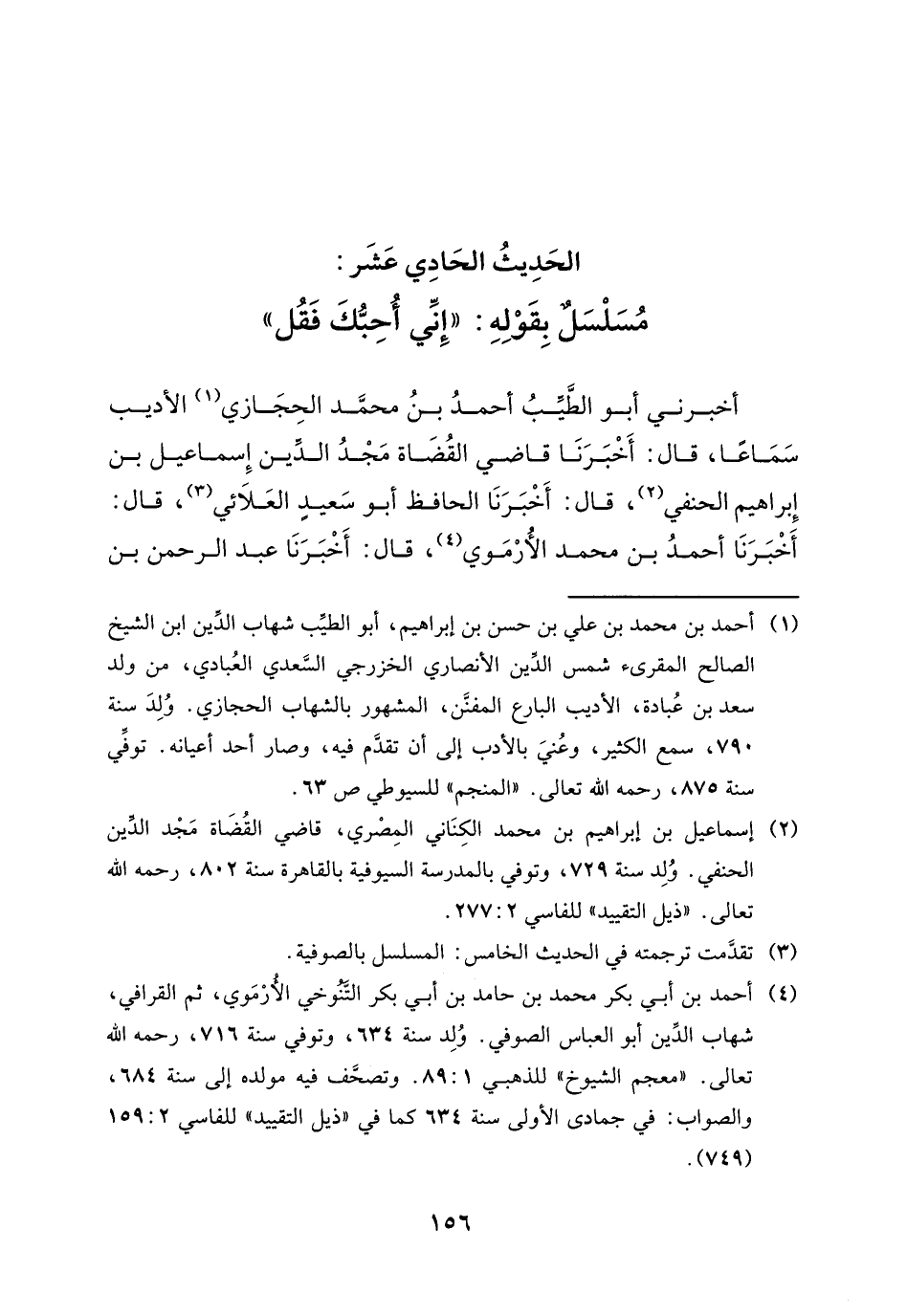 أَخْبَرَنِي أَبُو الطَّيِّبِ أَحْمَدُ بْنُ مُحَمَّدٍ الْحِجَازِيُّ، الأَدِيبُ سَمَاعًا، قَالَ: أَخْبَرَنَا قَاضِي الْقُضَاةِ مَجْدُ الدِّينِ إِسْمَاعِيلُ بْنُ إِبْرَاهِيمَ الْحَنَفِيُّ، قَالَ: أَخْبَرَنَا الحَافِظُ أَبُو سَعِيدٍ الْعَلائِيُّ، قَالَ: أَخْبَرَنَا أَحْمَدُ بْنُ مُحَمَّدٍ الأُرْمَوِيُّ، قَالَ: أَخْبَرَنَا عَبْدُ الرَّحْمَنِ بْنُ