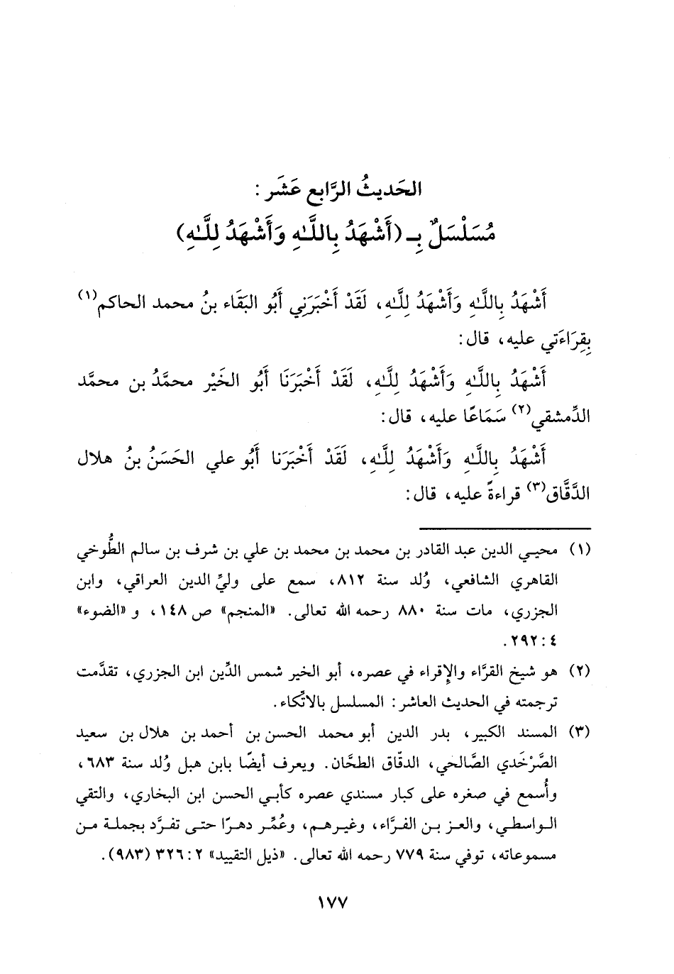 أَشْهَدُ بِاللَّهِ وَأَشْهَدُ لِلَّهِ، لَقَدْ أَخْبَرَنِي أَبُو الْبَقَاءِ بْنُ مُحَمَّدٍ الْحَاكِمُ، بِقِرَاءَتِي عَلَيْهِ، قَالَ: أَشْهَدُ بِاللَّهِ وَأَشْهَدُ لِلَّهِ، لَقَدْ أَخْبَرَنَا أَبُو الْخَيْرِ مُحَمَّدُ بْنُ مُحَمَّدٍ الدِّمَشْقِيُّ، سَمَاعًا عَلَيْهِ، قَالَ: أَشْهَدُ بِاللَّهِ وَأَشْهَدُ لِلَّهِ، لَقَدْ أَخْبَرَنَا أَبُو عَلِيٍّ الْحَسَنُ بْنُ هِلَالٍ الدَّقَّاقُ، قِرَاءَةً عَلَيْهِ، قَالَ: