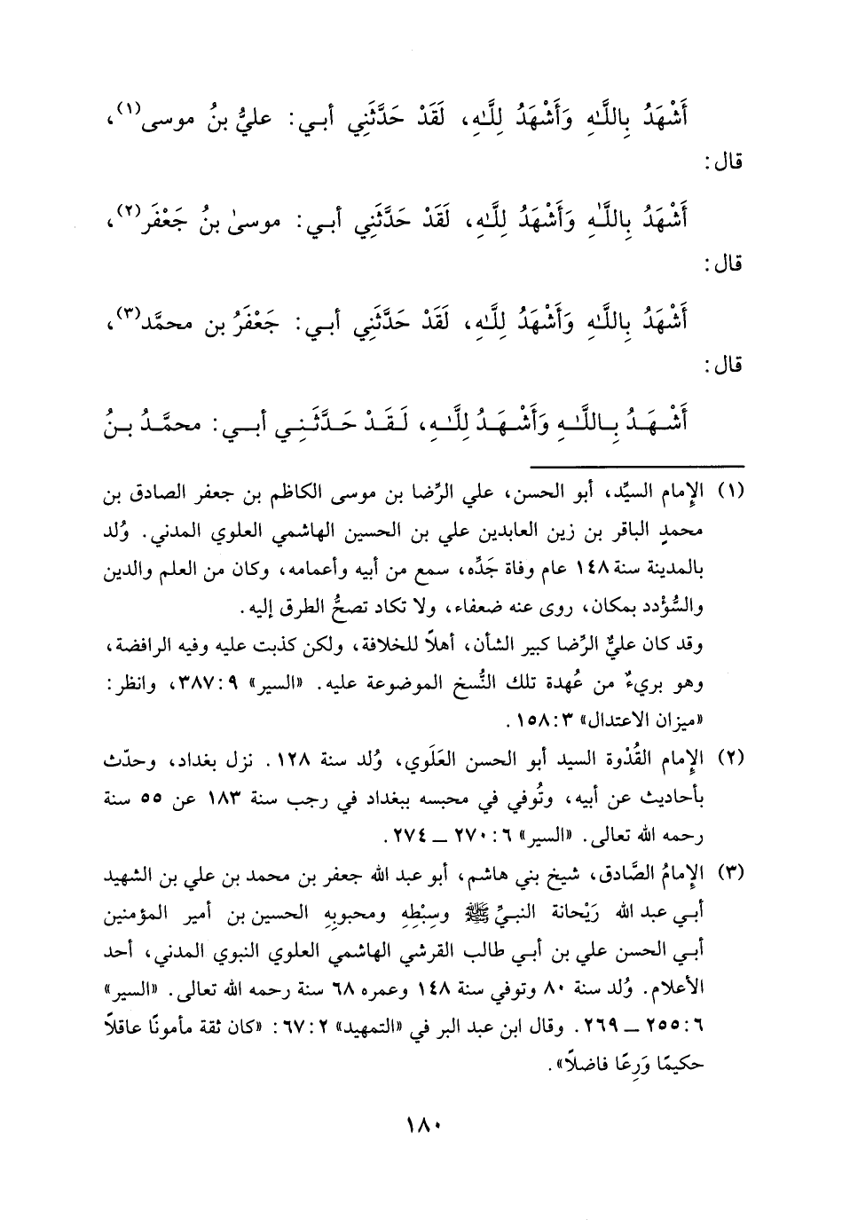 أَشْهَدُ بِاللَّهِ وَأَشْهَدُ لِلَّهِ، لَقَدْ حَدَّثَنِي أَبِي: عَلِيُّ بْنُ مُوسَى، قَالَ: أَشْهَدُ بِاللَّهِ وَأَشْهَدُ لِلَّهِ، لَقَدْ حَدَّثَنِي أَبِي: مُوسَى بْنُ جَعْفَرٍ، قَالَ: أَشْهَدُ بِاللَّهِ وَأَشْهَدُ لِلَّهِ، لَقَدْ حَدَّثَنِي أَبِي: جَعْفَرُ بْنُ مُحَمَّدٍ، قَالَ: أَشْهَدُ بِاللَّهِ وَأَشْهَدُ لِلَّهِ، لَقَدْ حَدَّثَنِي أَبِي: مُحَمَّدُ بْنُ