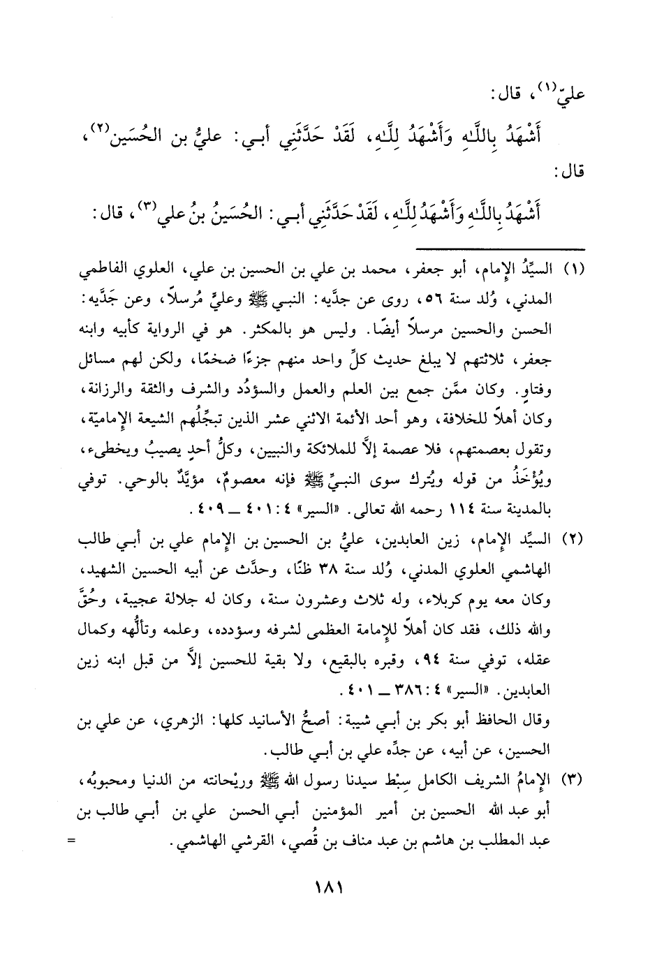 عَلِيٍّ، قَالَ: أَشْهَدُ بِاللَّهِ وَأَشْهَدُ لِلَّهِ، لَقَدْ حَدَّثَنِي أَبِي: عَلِيُّ بْنُ الْحُسَيْنِ، قَالَ: أَشْهَدُ بِاللَّهِ وَأَشْهَدُ لِلَّهِ، لَقَدْ حَدَّثَنِي أَبِي: الْحُسَيْنُ بْنُ عَلِيٍّ، قَالَ: