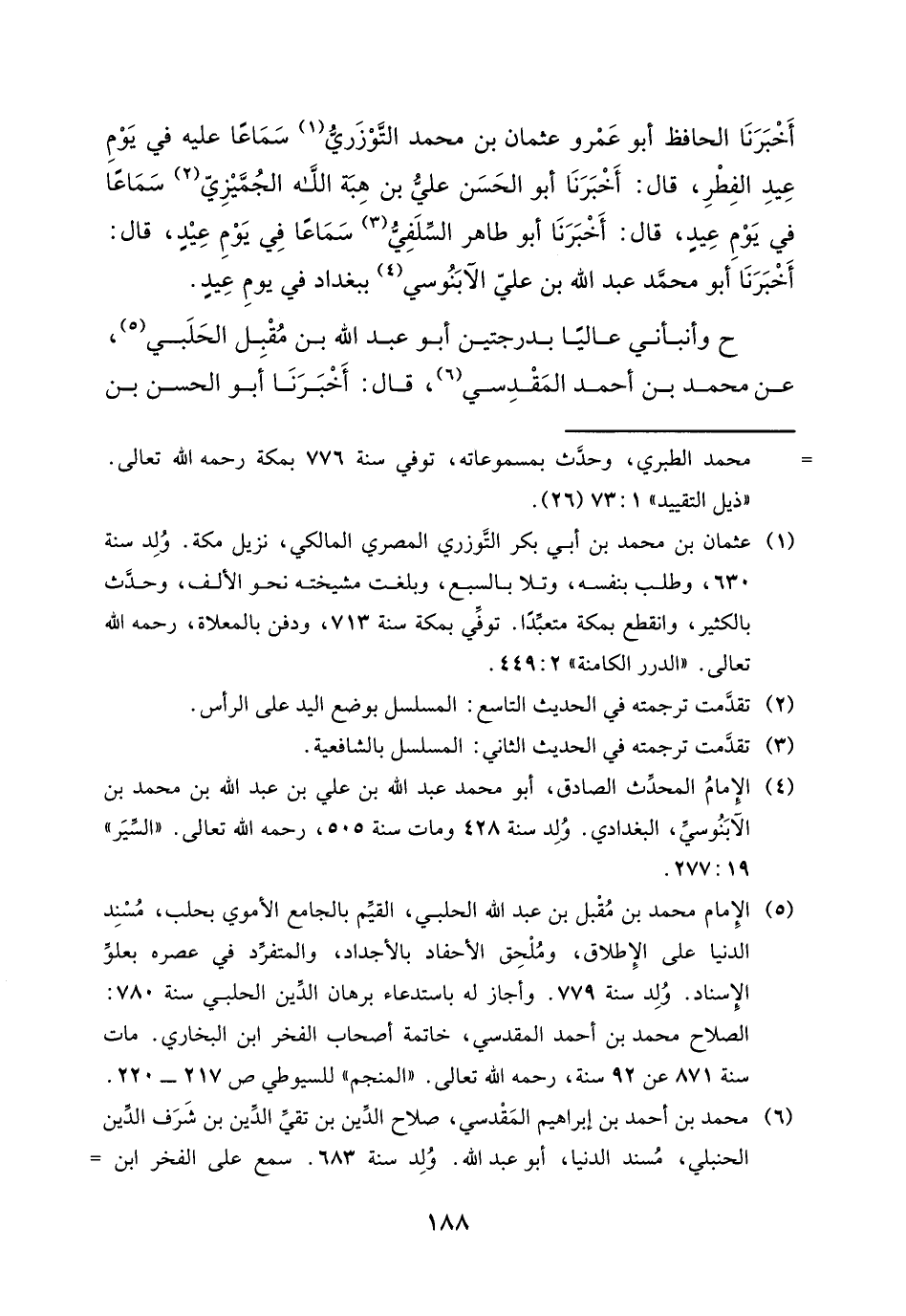أَخْبَرَنَا الْحَافِظُ أَبُو عَمْرٍو عُثْمَانُ بْنُ مُحَمَّدٍ التَّوْزَرِيُّ، سَمَاعًا عَلَيْهِ فِي يَوْمِ عِيدِ الْفِطْرِ، قَالَ: أَخْبَرَنَا أَبُو الْحَسَنِ عَلِيُّ بْنُ هِبَةِ اللَّهِ الْجُمَّيْزِيُّ، سَمَاعًا فِي يَوْمِ عِيدٍ، قَالَ: أَخْبَرَنَا أَبُو طَاهِرٍ السِّلَفِيُّ، سَمَاعًا فِي يَوْمِ عِيدٍ، قَالَ: أَخْبَرَنَا أَبُو مُحَمَّدٍ عَبْدُ اللَّهِ بْنُ عَلِيٍّ الْآبَنُوسِيُّ، بِبَغْدَادَ فِي يَوْمِ عِيدٍ.