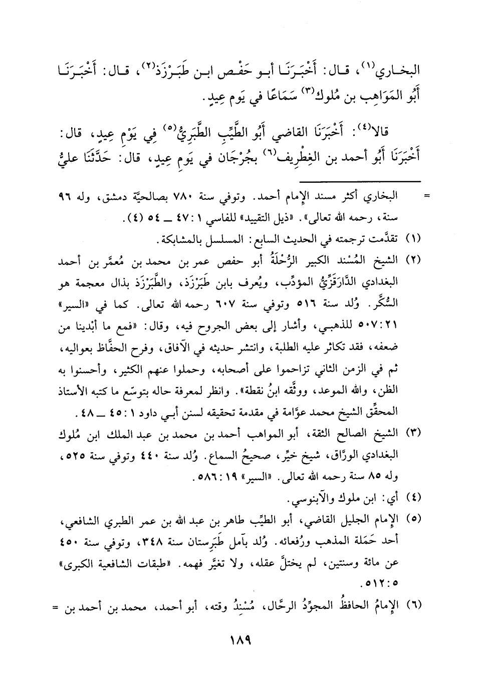 الْبُخَارِيِّ، قَالَ أَخْبَرَنَا أَبُو حَفْصِ بْنُ طَبَرْزَذَ، قَالَ: أَخْبَرَنَا أَبُو الْمَوَاهِبِ بْنُ مُلُوكٍ، سَمَاعًا فِي يَوْمِ عِيدٍ.