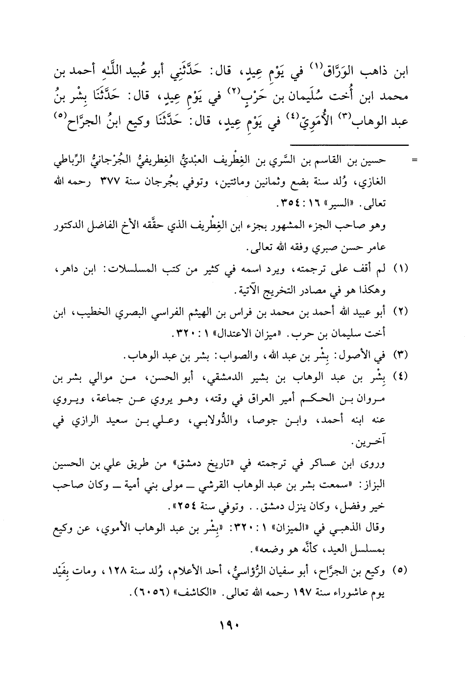 بْنُ ذَاهِبٍ الْوَرَّاقُ، فِي يَوْمِ عِيدٍ، قَالَ: حَدَّثَنِي أَبُو عُبَيْدِ اللَّهِ أَحْمَدُ بْنُ مُحَمَّدِ بْنِ أُخْتِ سُلَيْمَانَ بْنِ حَرْبٍ، فِي يَوْمِ عِيدٍ، قَالَ: حَدَّثَنَا بِشْرُ بْنُ عَبْدِ الْوَهَّابِ الْأُمَوِيُّ، فِي يَوْمِ عِيدٍ، قَالَ: حَدَّثَنَا وَكِيعُ بْنُ الْجَرَّاحِ،