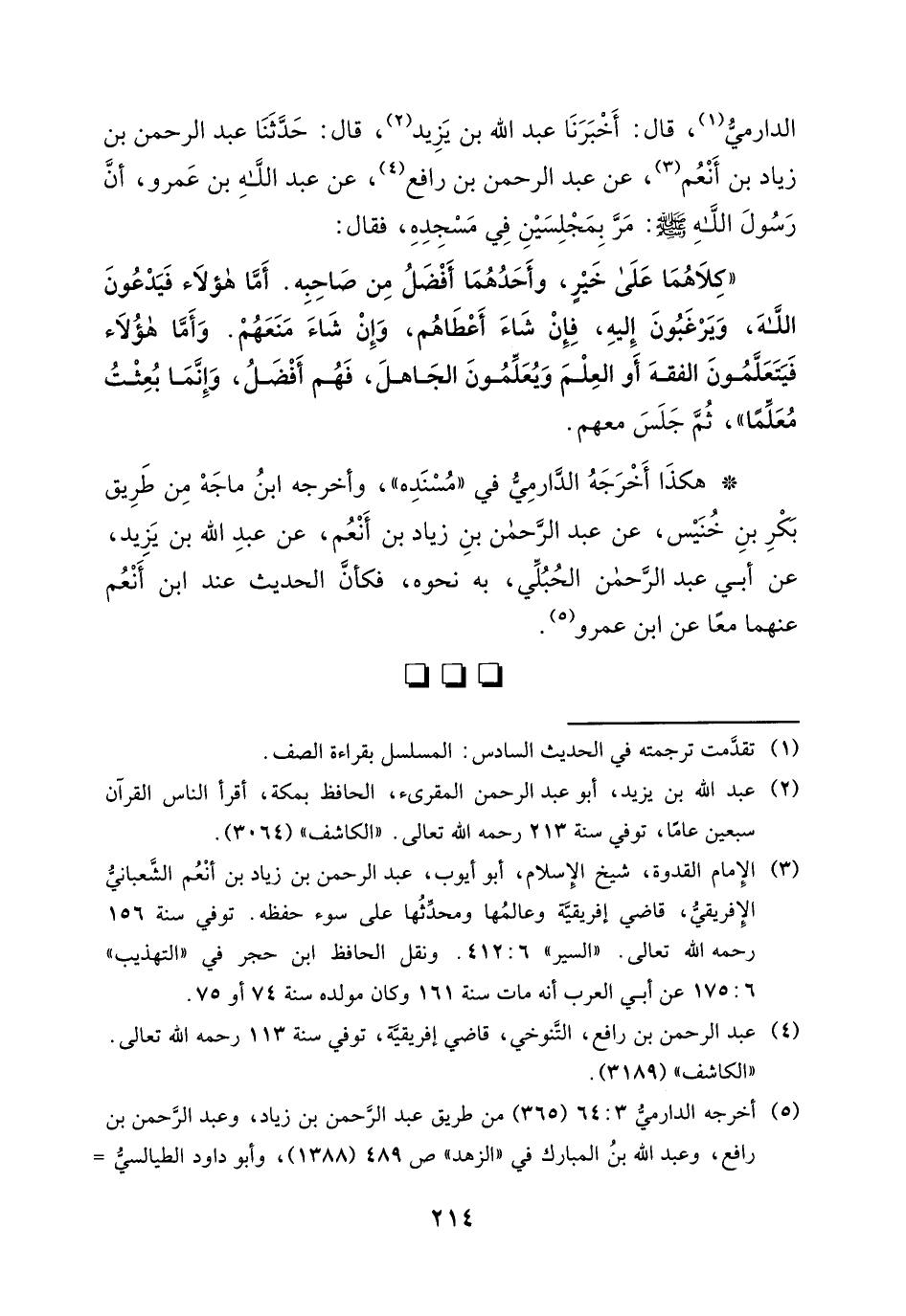 الدَّارِمِيُّ، قَالَ: أَخْبَرَنَا عَبْدُ اللَّهِ بْنُ يَزِيدَ، قَالَ: حَدَّثَنَا عَبْدُ الرَّحْمَنِ بْنُ زِيَادِ بْنِ أَنْعُمٍ، عَنْ عَبْدِ الرَّحْمَنِ بْنِ رَافِعٍ، عَنْ عَبْدِ اللَّهِ بْنِ عَمْرٍو، أَنّ رَسُولَ اللَّهِ صَلَّى اللَّهُ عَلَيْهِ وَسَلَّمَ: مَرَّ بِمَجْلِسَيْنِ فِي مَسْجِدِهِ، فَقَالَ: «كِلاهُمَا عَلَى خَيْرٍ، وَأَحَدُهُمَا أَفْضَلُ مِنْ صَاحِبِهِ.
