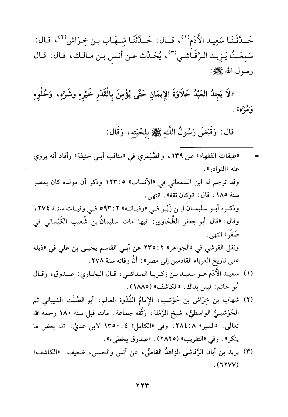 حَدَّثَنَا سَعِيدُ الأَدَمِ، قَالَ: حَدَّثَنَا شِهَابُ بْنُ خِرَاشٍ، قَالَ: سَمِعْتُ يَزِيدَ الرَّقَاشِيَّ، يُحَدِّثُ عَنْ أَنَسِ بْنِ مَالِكٍ، قال: قَالَ رَسُولُ اللَّهِ صَلَّى اللَّهُ عَلَيْهِ وَسَلَّمَ: «لا يَجِدُ الْعَبْدُ حَلَاوَةَ الإِيمَانِ، حَتَّى يُؤْمِنَ بِالْقَدَرِ خَيْرِهِ وَشَرِّهِ، وَحُلْوِهِ وَمُرِّهِ» .