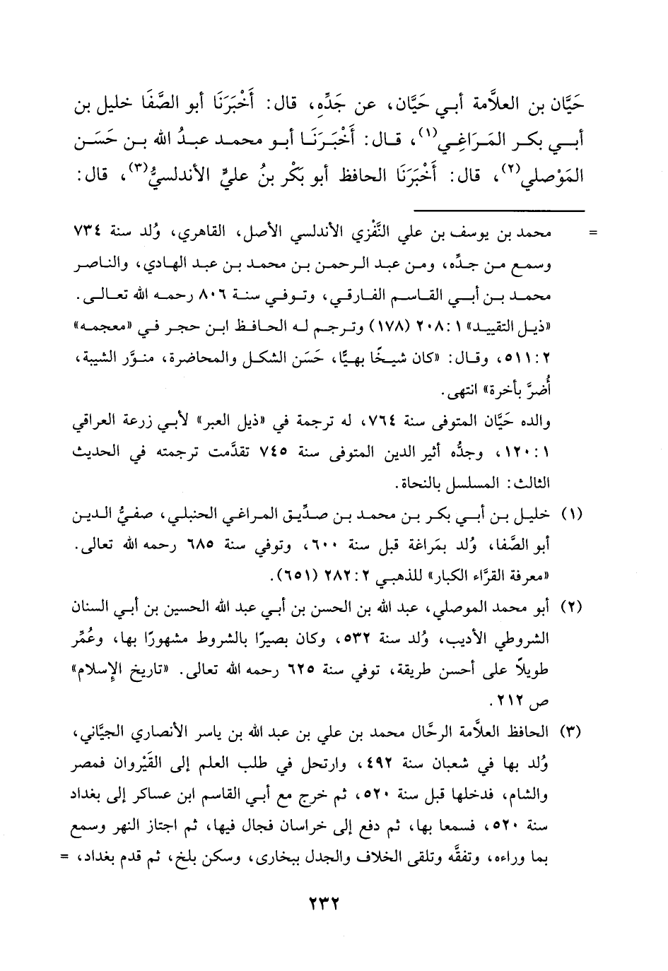 حَيَّانَ ابْنِ الْعَلامَةِ أَبِي حَيَّانَ عَنْ جَدِّهِ، قَالَ: أَخْبَرَنَا أَبُو الصَّفَا خَلِيلُ بْنُ أَبِي بَكْرٍ الْمَرَاغِيُّ، قَالَ: أَخْبَرَنَا أَبُو مُحَمَّدٍ عَبْدُ اللَّهِ بْنُ حَسَنٍ الْمَوْصِلِيُّ، قَالَ: أَخْبَرَنَا الْحَافِظُ أَبُو بَكْرِ بْنُ عَلِيٍّ الأَنْدَلُسِيُّ، قَالَ: