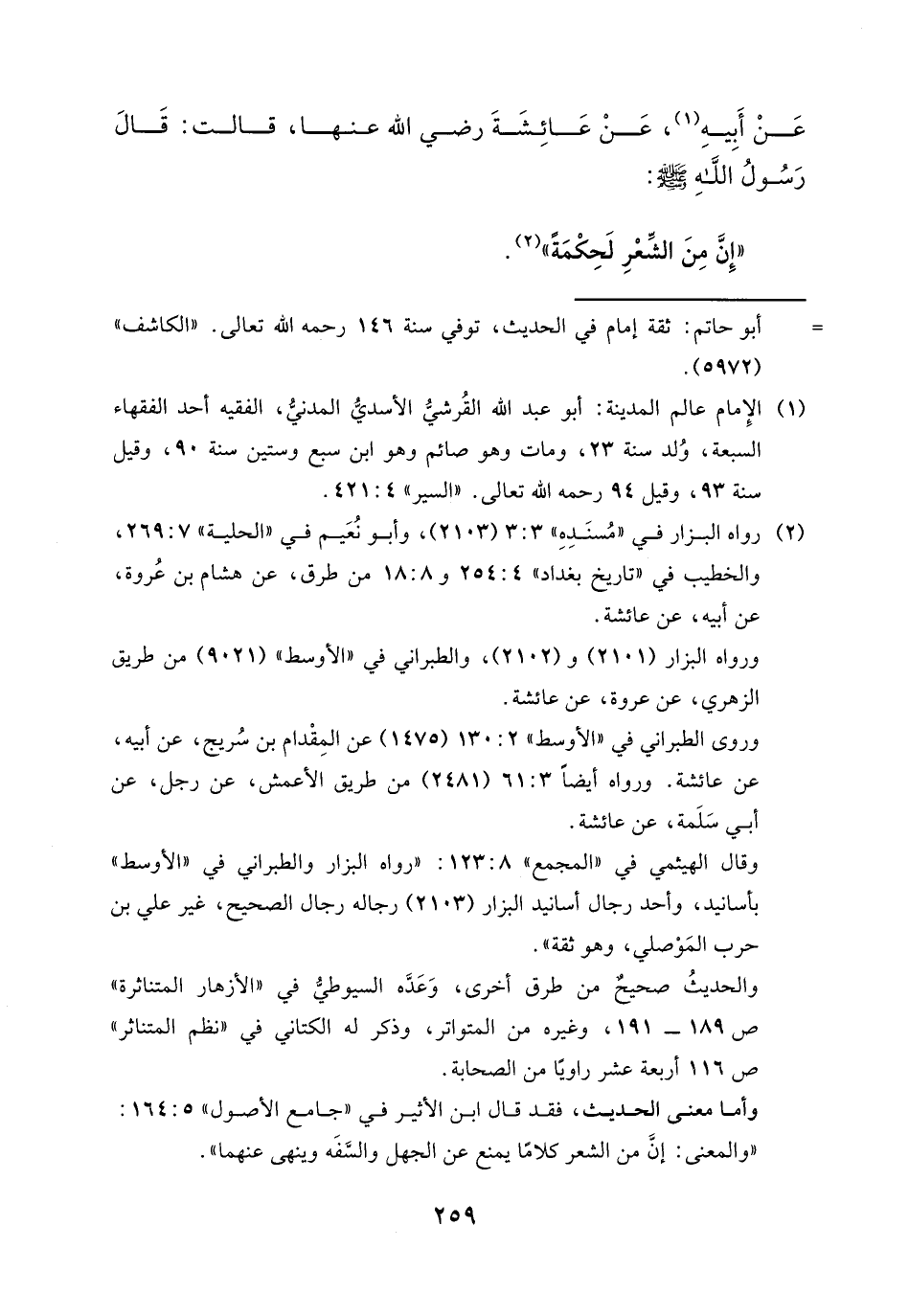 عَنْ أَبِيهِ، عَنْ عَائِشَةَ رَضِيَ اللَّهُ عَنْهَا، قَالَتْ: قَالَ رَسُولُ اللَّهِ صَلَّى اللَّهُ عَلَيْهِ وَسَلَّمَ: «إِنَّ مِنَ الشِّعْرِ لَحِكْمَةً» .