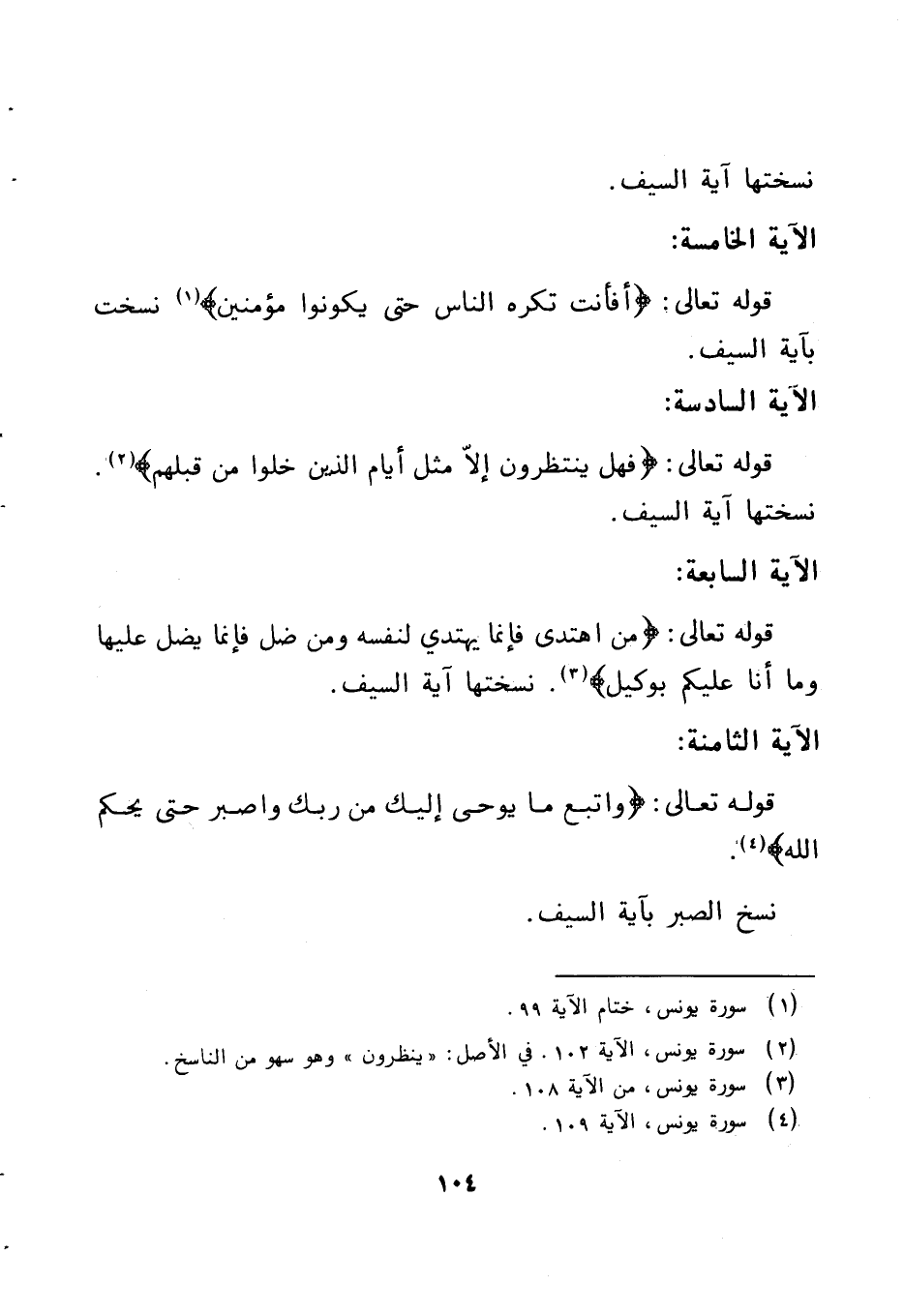 الْآيَة الْخَامِسَة قَوْله تَعَالَى {أَفَأَنتَ تُكرِهُ الناسَ حَتّى يَكونوا مُؤمِنين} نسخت بِآيَة السَّيْف