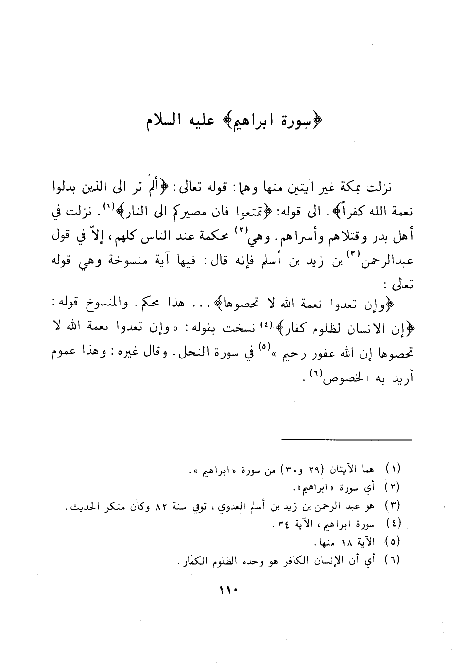 نزلت بِمَكَّة غير أيتين مِنْهَا وهما قَوْله تَعَالَى {ألم تَرَ إِلى الَّذينَ بَدَّلوا نِعمَةَ اللَهِ كُفراً} الى قَوْله {تمَتَّعُوا فَأِنَّ مَصيرَكُم إِلى النَّار} نزلت فِي أهل بدر وقتلاهم وأسراهم وَهِي محكمَة عِنْد النَّاس كلهم إِلَّا فِي قَول عبد الرَّحْمَن بن زيد بن أسلم فَإِن قَالَ فِيهَا آيَة مَنْسُوخَة وَهِي قَوْله تَعَالَى {وَإِن تَعُدّوا نِعمَةَ اللَهِ لَا تُحصوها} هَذَا مُحكم والمنسوخ قَوْله {إِنَّ الإِنسانَ لَظلومُ كَفّارٌ} نسخت بقوله {وَإِن تُعدّوا نِعمَةَ اللَهِ لَا تُحصوها إِن اللَهَ لغَفُور رَحِيم} فِي سُورَة النَّحْل وَقَالَ غَيره وَهَذَا عُمُوم أُرِيد بِهِ الْخُصُوص