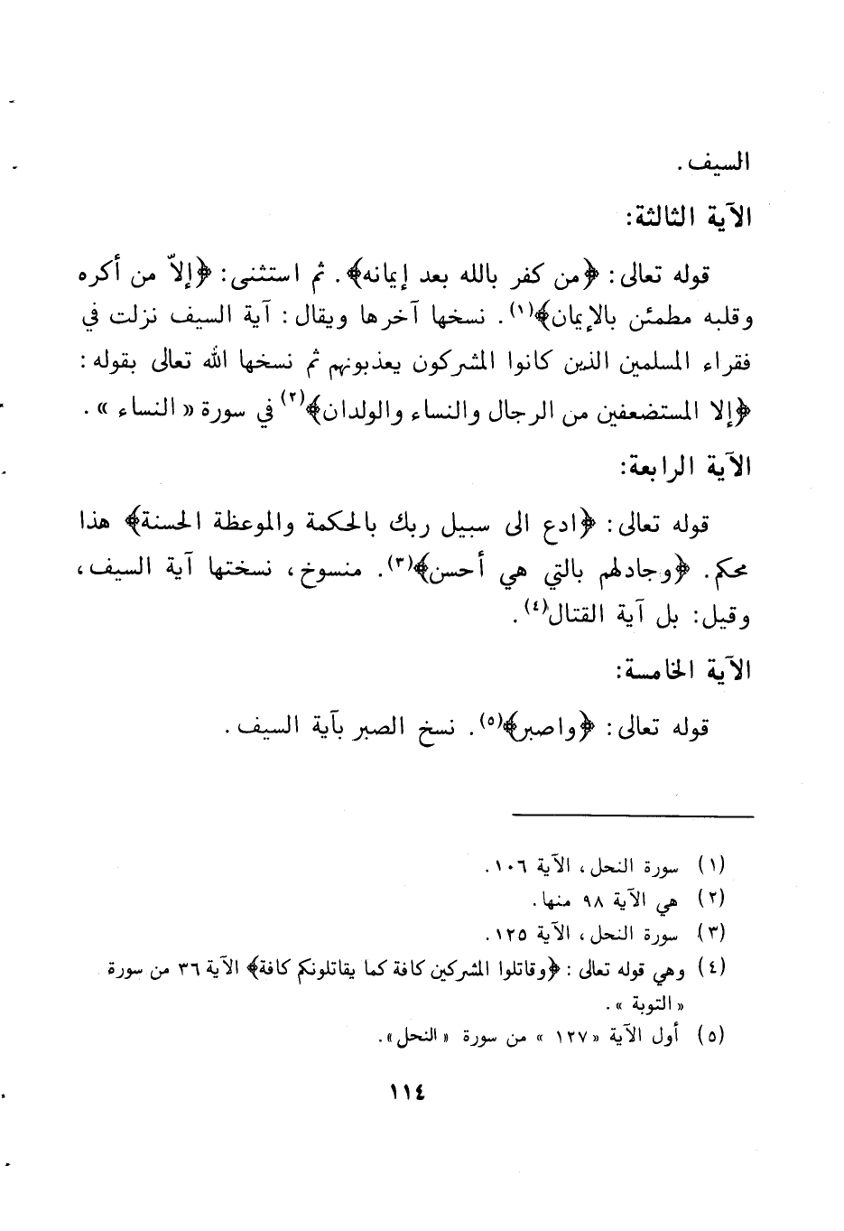 الْآيَة الثَّالِثَة قَوْله تَعَالَى {مَن كَفَرَ بِاللَهِ مِن بَعدِ إيمانِه} ثمَّ اسْتثْنى {إِلّا مَن أُكرِهَ وَقَلبُهُ مَطمَئِنٌ بِالإيمانِ} نسخهَا آخرهَا وَيُقَال آيَة السَّيْف نزلت فِي فُقَرَاء الْمُسلمين الَّذين كَانُوا الْمُشْركُونَ يعذبونهم ثمَّ نسخهَا الله تَعَالَى بقوله {إِلّا المُستَضعَفينَ مِنَ الرِجالِ وَالنِساءِ وَالوِلدانِ} فِي سُورَة النِّسَاء