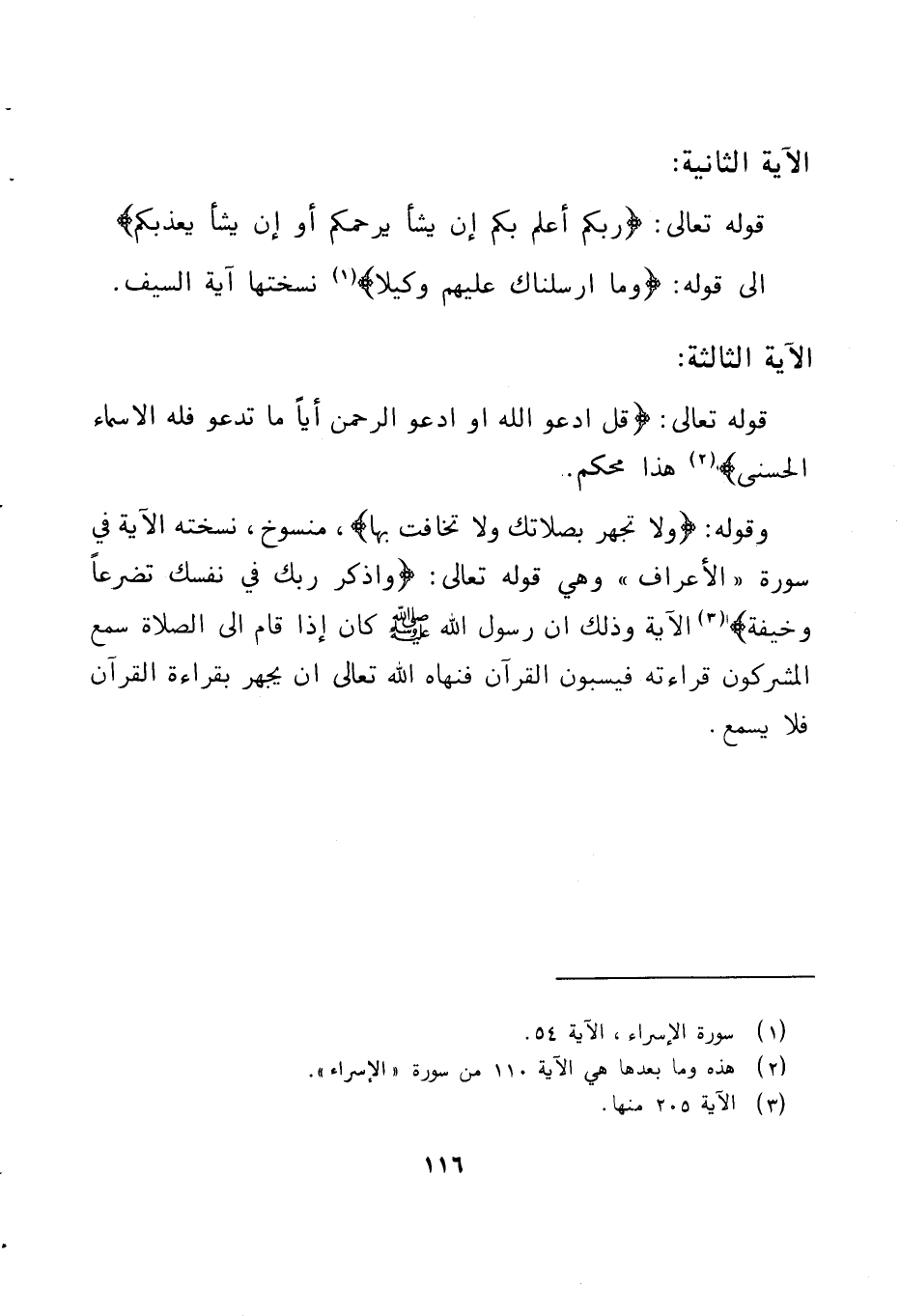الْآيَة الثَّالِثَة قَوْله تَعَالَى {قل ادعوا الله أَو ادعوا الرَّحْمَن أيا مَا تدعوا فَلهُ الْأَسْمَاء الْحسنى} هَذَا مُحكم وَقَوله {وَلَا تجْهر بصلاتك وَلَا تخَافت بهَا} مَنْسُوخ نسخته الْآيَة فِي سُورَة الْأَعْرَاف وَهِي قَوْله تَعَالَى {وَاِذكُر رَبك فِي نَفسك تضرعا وخيفة} الْآيَة وَذَلِكَ أَن رَسُول الله (صلى الله عَلَيْهِ وَسلم) كَانَ إِذا قَامَ إِلَى الصَّلَاة سمع الْمُشْركُونَ قِرَاءَته فيسبون الْقُرْآن فَنَهَاهُ الله تَعَالَى ان يجْهر بِقِرَاءَة الْقُرْآن فَلَا يسمع
