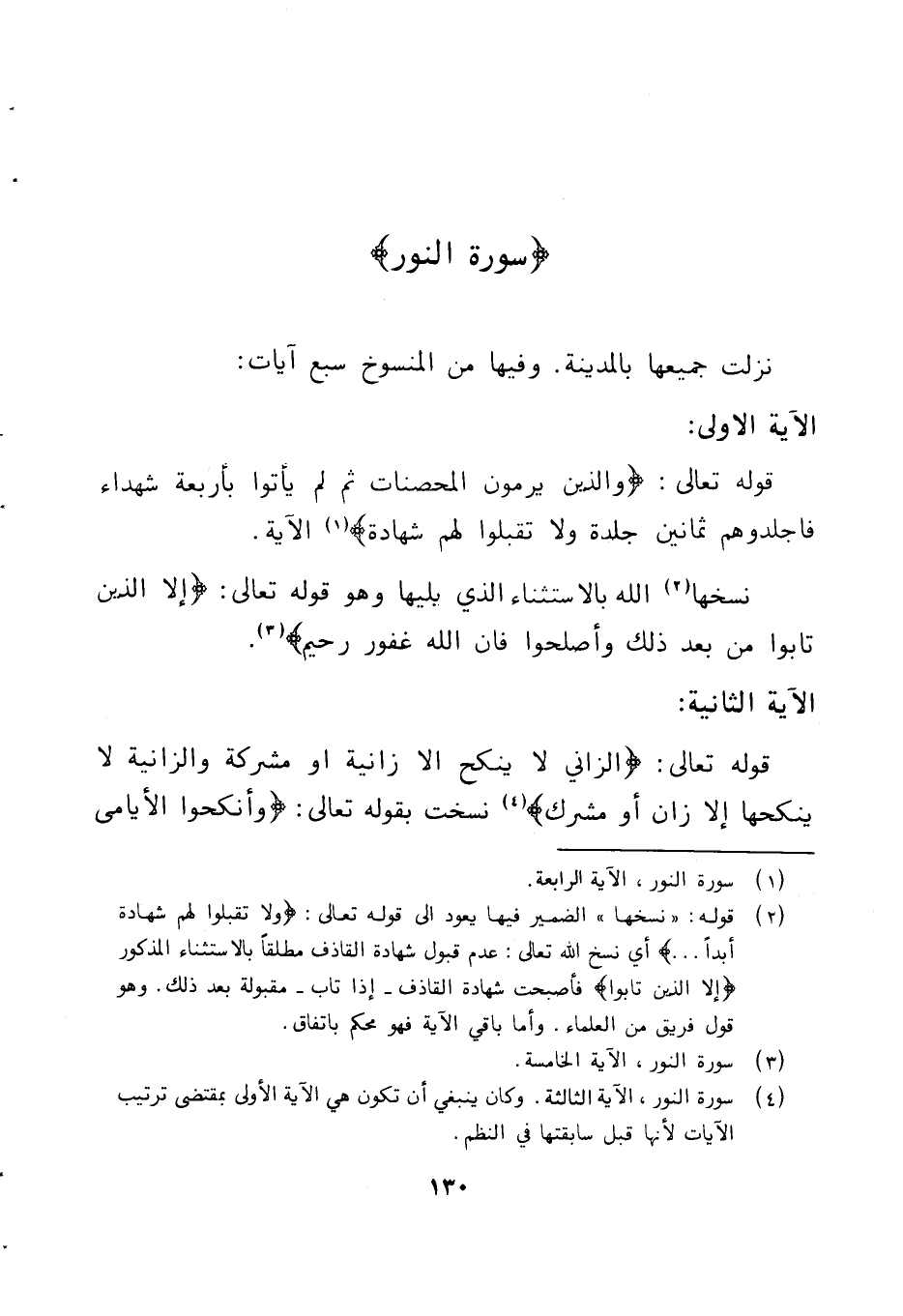 الْآيَة الأولى قَوْله تَعَالَى {وَالَّذينَ يَرمونَ المُحصَناتِ ثُمَّ لَم يَأتوا بِأَربَعَةِ شُهَداءَ فَاِجلِدوهُم ثَمانينَ جَلدَة وَلَا تقبلُوا لَهُم شَهَادَة} الْآيَة نسخهَا الله باالإستثناء الَّذِي يَليهَا وَهُوَ قَوْله تَعَالَى {إِلّا الَّذينَ تَابُوا مِن بعد ذَلِك وَأَصْلحُوا فَإِن الله غَفُور رَحِيم}