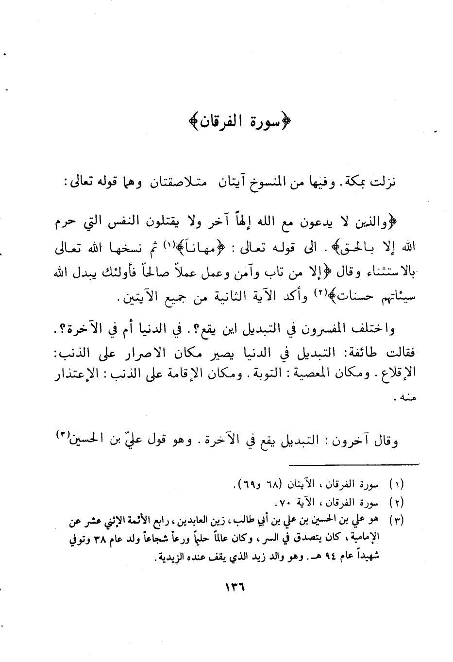 نزلت بِمَكَّة وفيهَا من الْمَنْسُوخ آيتان متلاصقتان وهما قَوْله تَعَالَى {وَالَّذينَ لَا يَدعونَ مَعَ اللَهَ إِلَهًا آخر وَلَا يقتلُون النَّفس الَّتِي حرم الله إِلَّا بِالْحَقِّ} الى قَوْله تَعَالَى {مهانا} ثمَّ نسخهَا الله تَعَالَى بالآستثناء وَقَالَ {إِلَّا من تَابَ وآمن وَعمل عملا صَالحا فَأُولَئِك يُبدل الله سيئاتهم حَسَنَات} وأكد الْآيَة الثَّانِيَة من جَمِيع الْآيَتَيْنِ وَاخْتلف الْمُفَسِّرُونَ فِي التبديل أَيْن يَقع فِي الدُّنْيَا أم فِي الْآخِرَة فَقَالَت طَائِفَة التبديل فِي الدُّنْيَا يصير مَكَان الْإِصْرَار على الذَّنب الإقلاع وَمَكَان الْمعْصِيَة التَّوْبَة وَمَكَان الْإِقَامَة على الذَّنب الإعتذار مِنْهُ وَقَالَ آخَرُونَ التبديل يَقع فِي الْآخِرَة وَهُوَ قَول عَليّ بن الْحُسَيْن