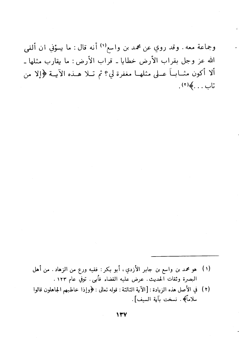 وَجَمَاعَة مَعَه وَقد رُوِيَ عَن مُحَمَّد بن وَاسع أَنه قَالَ مَا يَسُؤْنِي أَن ألْقى الله عز وَجل بقراب الأَرْض خَطَايَا قرَاب الأَرْض مَا يُقَارب مثلهَا أَلا أكون مثابا على مثلهَا مغْفرَة لي ثمَّ تَلا هَذِه الْآيَة {إِلّا مَن تابَ}