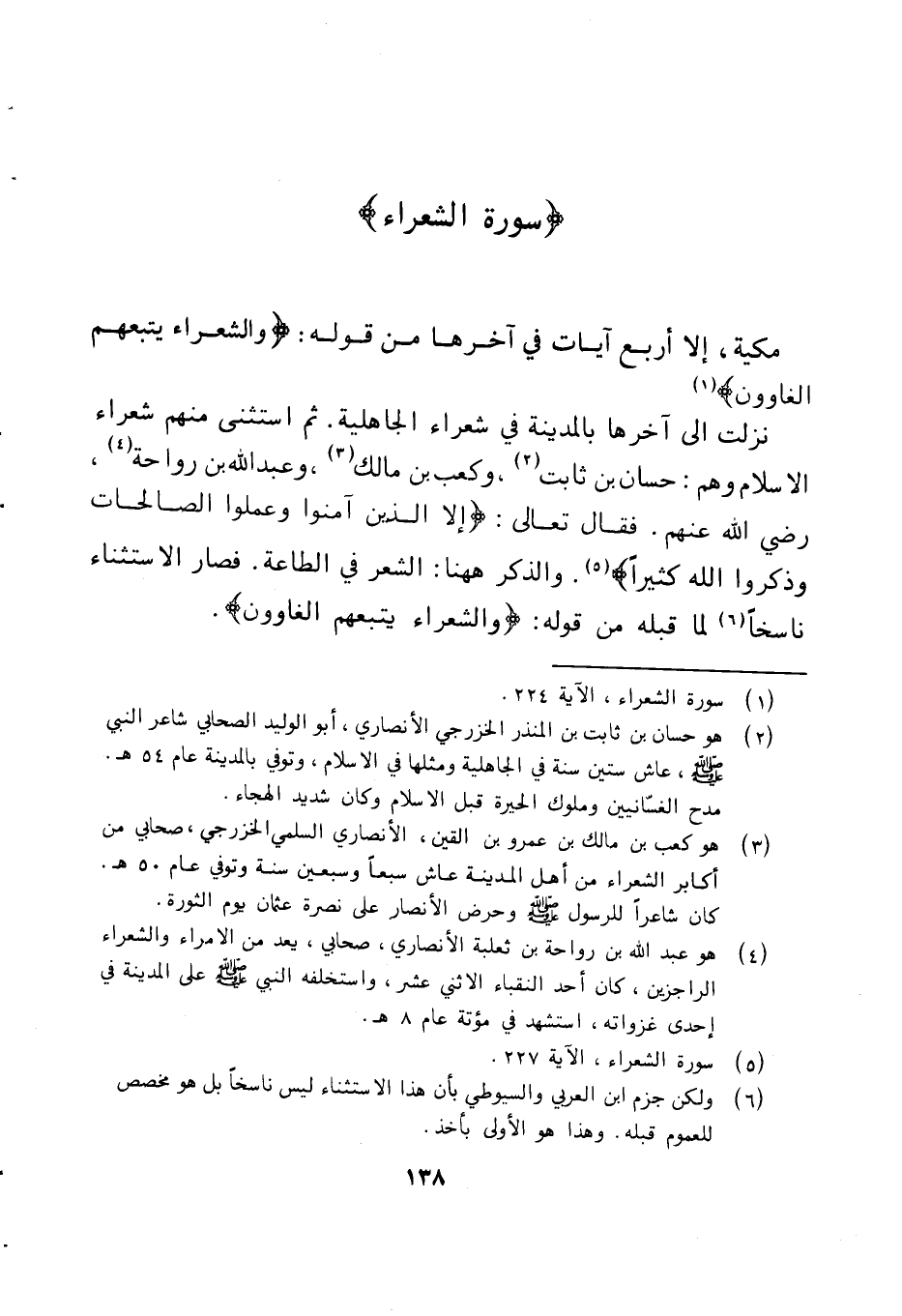 نزلت الى أَخّرهَا بِالْمَدِينَةِ فِي شعراء الْجَاهِلِيَّة ثمَّ اسْتثْنى مِنْهُم شعراء الاسلام وهم حسان بن ثَابت وَكَعب بن مَالك وَعبد الله بن رَوَاحَة رَضِي الله عَنْهُم فَقَالَ تَعَالَى {إِلَّا الَّذينَ آمَنوا وَعَمِلوا الصالِحاتِ وَذَكَروا اللَهَ كَثيراً} وَالذكر هَهُنَا الشّعْر فِي الطَّاعَة فَصَارَ الِاسْتِثْنَاء نَاسِخا لما قبله من قَوْله {وَالشعرَاء يتبعهُم الْغَاوُونَ}