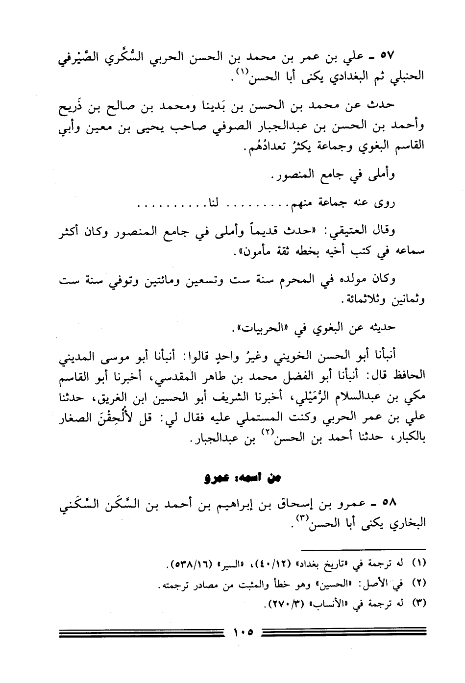 57- علي بن عمر بن محمد بن الحسن الحربي السكري الصيرفي الحنبلي ثم البغدادي يكنى أبا الحسن.