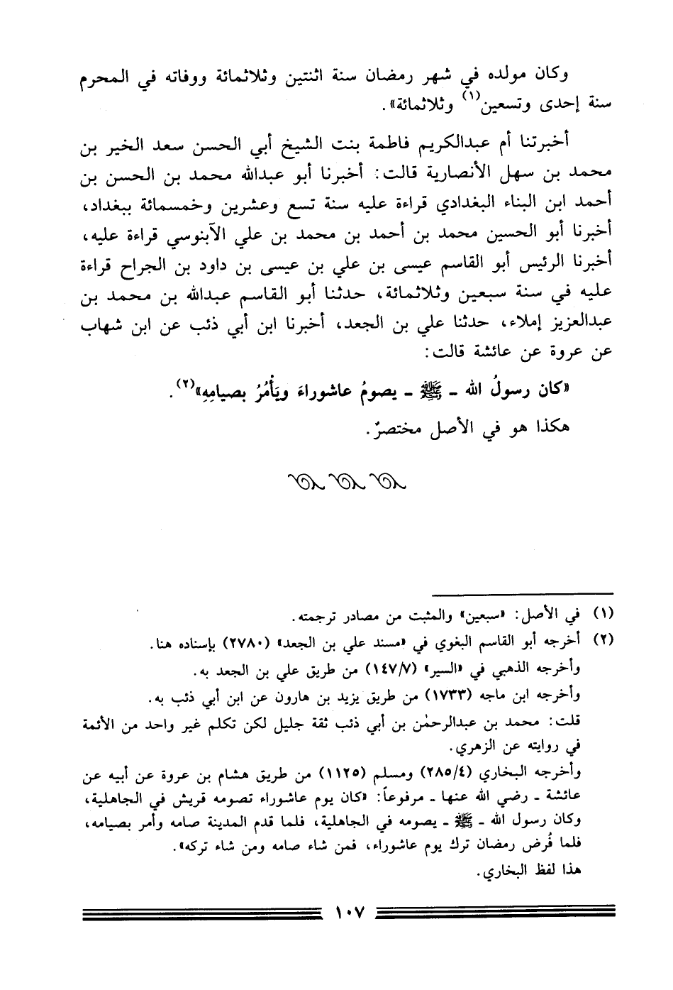 أَخْبَرَتْنَا أُمُّ عَبْدِ الْكَرِيمِ فَاطِمَةُ بِنْتُ الشَّيْخِ أَبِي الْحَسَنِ سَعْدِ الْخَيْرِ بْنُ مُحَمَّدِ بْنِ سَهْلٍ الأَنْصَارِيَّةُ قَالَتْ: أَخْبَرَنَا أَبُو عَبْدِ اللَّهِ مُحَمَّدُ بْنُ الْحَسَنِ بْنِ أحمد ابن الْبَنَّاءِ الْبَغْدَادِيُّ قِرَاءَةً عَلَيْهِ سَنَةَ تسع وعشرين وخمسمائة بِبَغْدَادَ، أَخْبَرَنَا أَبُو الْحُسَيْنِ مُحَمَّدُ بن أحمد بن محمد بن عَلِيٍّ الآبَنُوسِيُّ قِرَاءَةً عَلَيْهِ، أَخْبَرَنَا الرَّئِيسُ أَبُو الْقَاسِمِ عِيسَى بْنُ علي بن عيسى بن داود بْنِ الْجَرَّاحِ قِرَاءَةً عَلَيْهِ فِي سنة سبعين وثلاثمائة، حَدَّثَنَا أَبُو الْقَاسِمِ عَبْدُ اللَّهِ بن محمد بن عبد العزيز إِمْلاءً، حَدَّثَنَا عَلِيُّ بْنُ الْجَعْدِ، أَخْبَرَنَا ابْنُ أَبِي ذِئْبٍ عَنِ ابْنِ شِهَابٍ عَنْ عُرْوَةَ عَنْ عَائِشَةَ قَالَتْ: