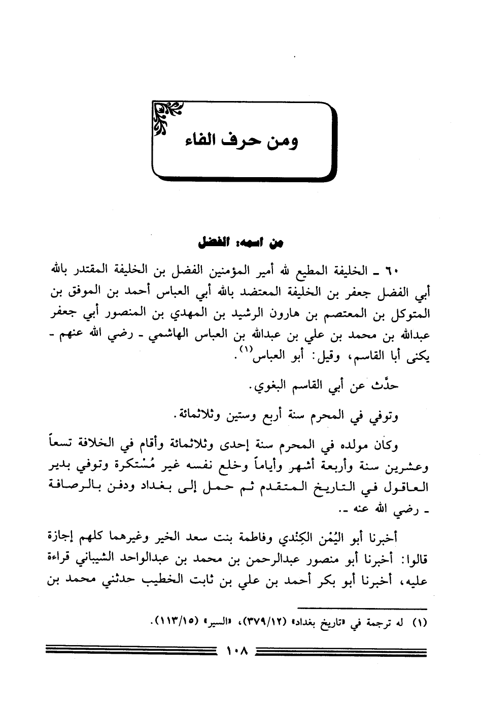 60- الخليفة المطيع لله أمير المؤمنين الفضل بن الخليفة المقتدر بالله أبي الفضل جعفر بن الخليفة المعتضد بالله أبي العباس أحمد بن الموفق بن المتوكل بن المعتصم بن هارون الرشيد بن المهتدي بن المنصور أبي جعفر عبد الله بن محمد بن علي بن عبد الله بن العباس الهاشمي -رضي الله عنهم- يكنى أبا القاسم، وقيل أبو العباس.