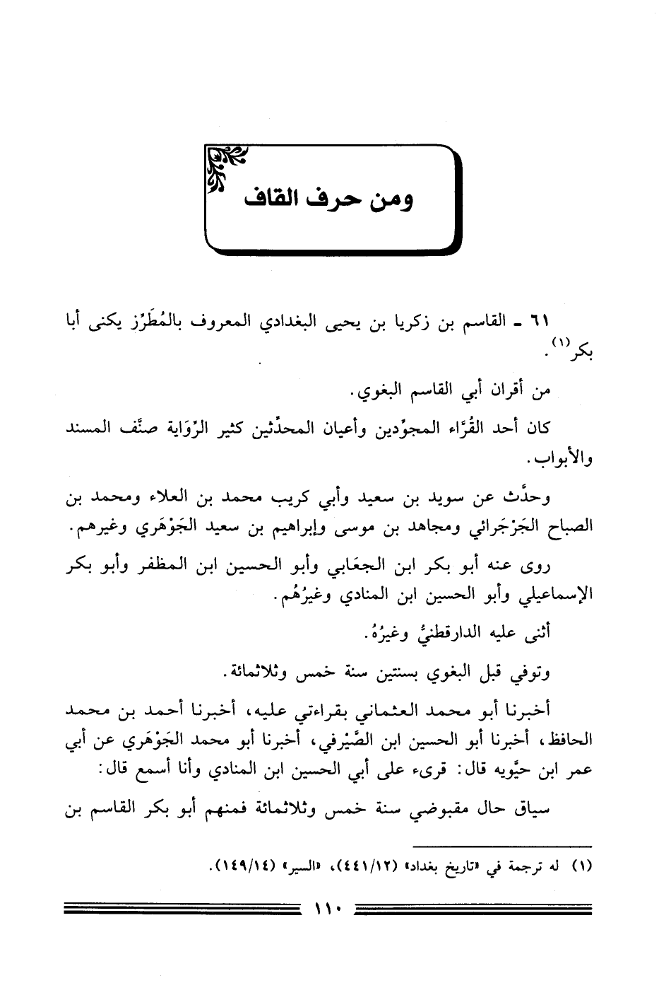 61- القاسم بن زكريا بن يحيى البغدادي المعروف بالمطرز يكنى أبا بكر.