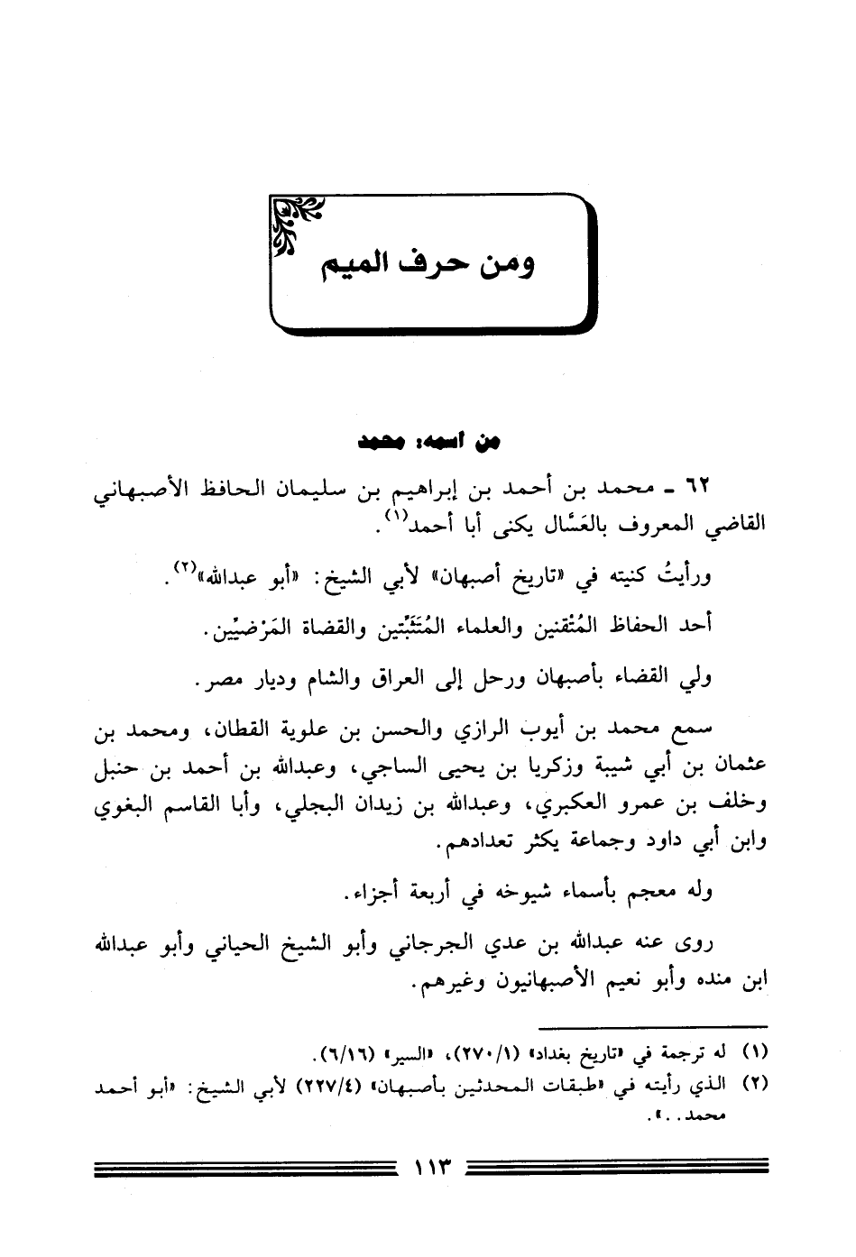 62- محمد بن أحمد بن إبراهيم بن سليمان الحافظ الأصبهاني القاضي المعروف بالعسال يكنى أبا أحمد.