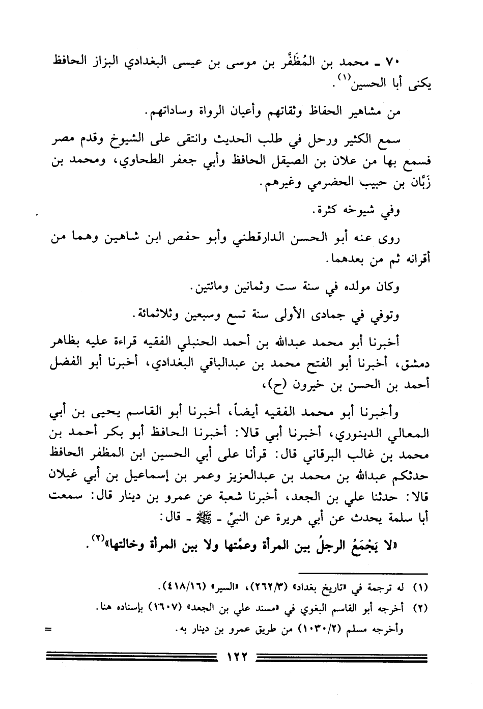70- محمد بن المظفر بن موسى بن عيسى البغدادي البزاز الحافظ يكنى أبا الحسين.