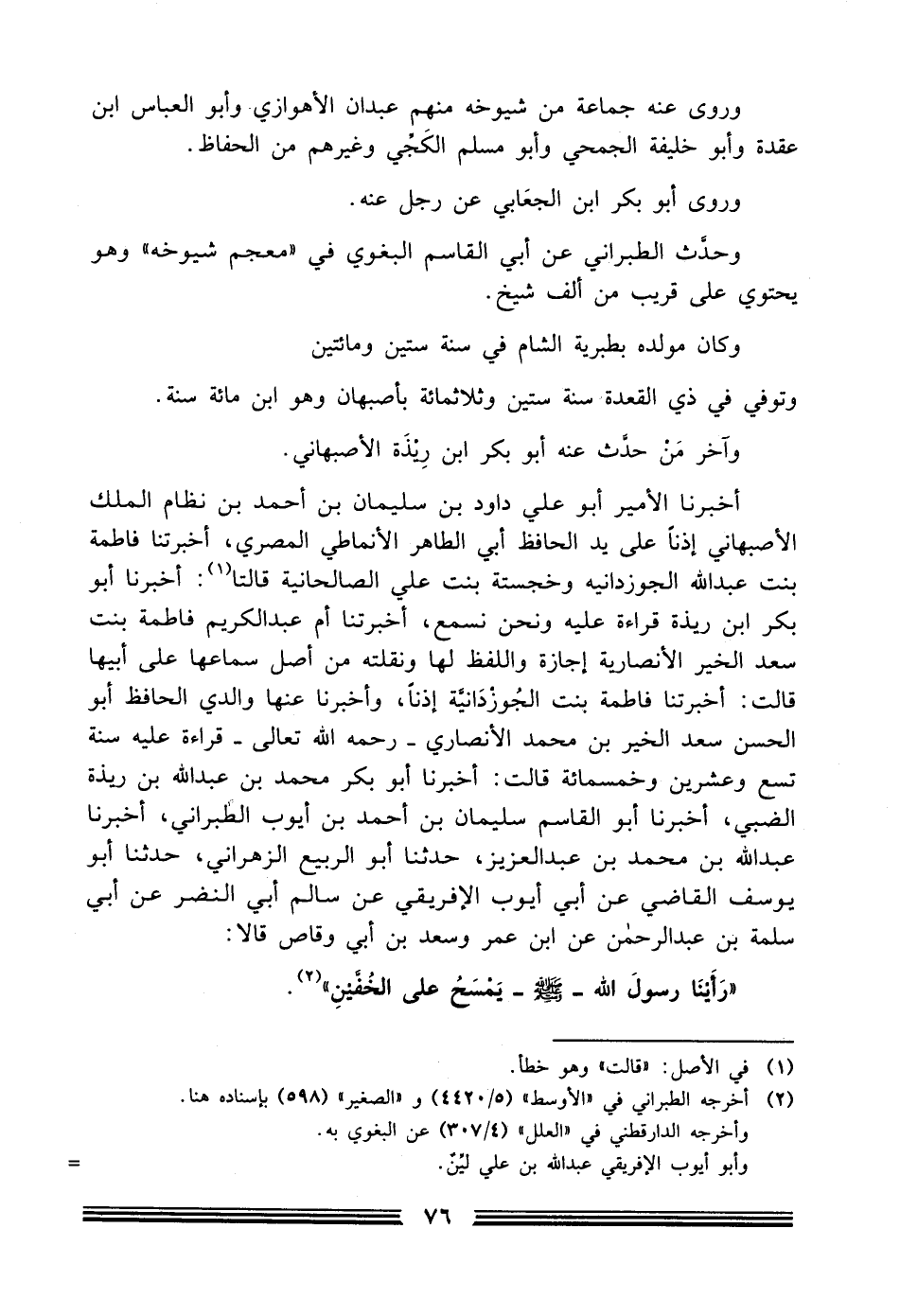 أَخْبَرَنَا الأَمِيرُ أَبُو عَلِيٍّ دَاوُدُ بْنُ سُلَيْمَانَ بْنِ أَحْمَدَ بْنِ نِظَامِ الْمُلْكِ الأَصْبَهَانِيُّ إِذْنًا عَلَى يَدِ الْحَافِظِ أَبِي الطَّاهِرِ الأَنْمَاطِيِّ الْمِصْرِيِّ، أَخْبَرَتْنَا فَاطِمَةُ بِنْتُ عَبْدِ اللَّهِ الْجَوْزَدَانِيَّةُ وَخَجْسَتَةُ بِنْتُ عَلِيٍّ الصَّالْحَانِيَّةُ قَالَتَا: أَخْبَرَنَا أبو بكر ابن رِيذَةَ قِرَاءَةً عَلَيْهِ وَنَحْنُ نَسْمَعُ، أَخْبَرَتْنَا أُمُّ عَبْدِ الْكَرِيمِ فَاطِمَةُ بِنْتُ سَعْدِ الْخَيْرِ الأَنْصَارِيَّةُ إِجَازَةً وَاللَّفْظُ لَهَا وَنَقَلَتْهُ مِنْ أَصْلِ سَمَاعِهَا عَلَى أَبِيهَا قَالَتْ: أَخْبَرَتْنَا فَاطِمَةُ بِنْتُ الْجَوْزَدَانِيَّةِ إِذْنًا، وَأَخْبَرَنَا عَنْهَا وَالِدِي الْحَافِظُ أَبُو الْحَسَنِ سَعْدُ الْخَيْرِ بْنُ مُحَمَّدٍ الأَنْصَارِيُّ -رَحِمَهُ اللَّهُ تَعَالَى- قِرَاءَةً عَلَيْهِ سنة تسع وعشرين وخمسمائة قَالَتْ: أَخْبَرَنَا أَبُو بَكْرٍ مُحَمَّدُ بْنُ عَبْدِ اللَّهِ بْنِ رِيذَةَ الضَّبِّيُّ، أَخْبَرَنَا أَبُو الْقَاسِمِ سُلَيْمَانُ بْنُ أَحْمَدَ بْنِ أَيُّوبَ الطَّبَرَانِيُّ، أَخْبَرَنَا عَبْدُ اللَّهِ بْنُ مُحَمَّدِ بْنِ عَبْدِ الْعَزِيزِ، حَدَّثَنَا أَبُو الرَّبِيعِ الزَّهْرَانِيُّ، حَدَّثَنَا أَبُو يُوسُفَ الْقَاضِي عَنْ أَبِي أَيُّوبَ الإِفْرِيقِيُّ عَنْ سَالِمٍ أَبِي النَّضْرِ عَنْ أَبِي سَلَمَةَ بْنِ عَبْدِ الرَّحْمَنِ عَنِ ابْنِ عُمَرَ وَسَعْدِ بْنِ أَبِي وَقَّاصٍ قَالا: