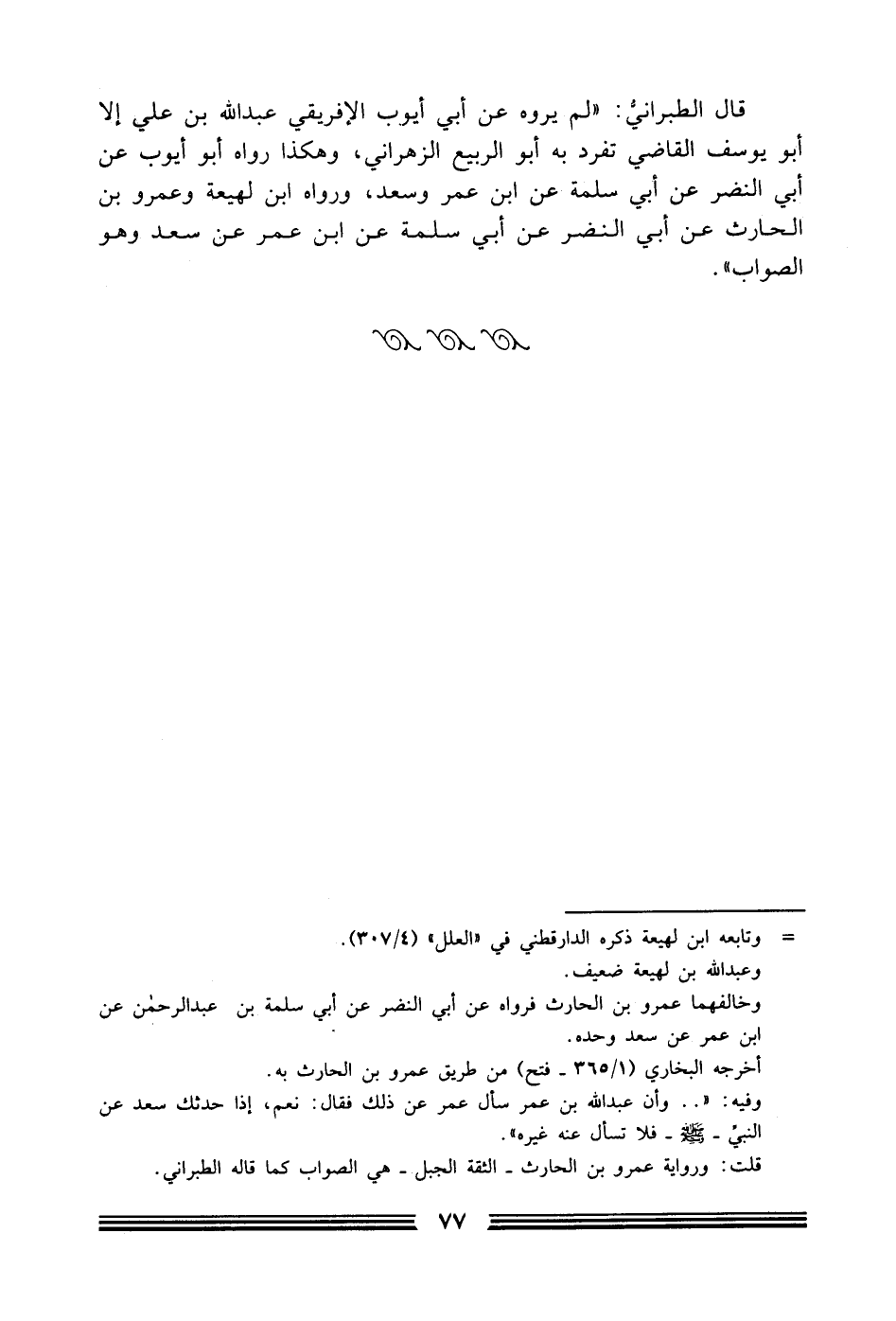 قَالَ الطَّبَرَانِيُّ: ((لَمْ يَرْوِهِ عَنْ أَبِي أَيُّوبَ الإِفْرِيقِيِّ عَبْدِ اللَّهِ بْنِ عَلِيٍّ إِلا أَبُو يُوسُفَ الْقَاضِي تَفَرَّدَ بِهِ أَبُو الرَّبِيعِ الزَّهْرَانِيُّ، وَهَكَذَا رَوَاهُ أَبُو أَيُّوبَ عَنْ أَبِي النَّضْرِ عَنْ أَبِي سَلَمَةَ عَنِ ابْنِ عُمَرَ وَسَعْدٍ، وَرَوَاهُ ابْنُ لَهِيعَةَ وَعَمْرُو بْنُ الْحَارِثِ عَنْ أَبِي النَّضْرِ عَنْ أَبِي سَلَمَةَ عَنِ ابْنِ عُمَرَ عَنْ سَعْدٍ وَهُوَ الصَّوَابُ)) .