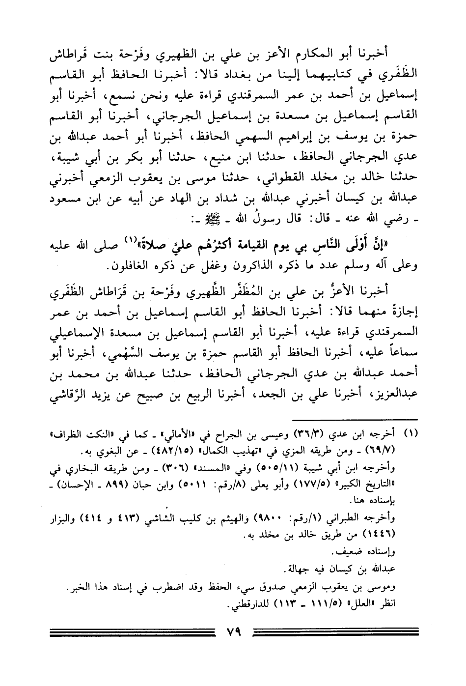 أَخْبَرَنَا أبو المكارم الأَعَزُّ بْنُ علي بن الظهيري وفرحة بنت قَرَاطَاشَ الظَّفَرِيُّ في كتابيهما إلينا من بغداد قَالا: أَخْبَرَنَا الْحَافِظُ أَبُو الْقَاسِمِ إِسْمَاعِيلُ بْنُ أَحْمَدَ بْنِ عُمَرَ السَّمَرْقَنْدِيُّ قِرَاءَةً عَلَيْهِ وَنَحْنُ نَسْمَعُ، أخبرنا أبو القاسم إسماعيل بن مَسْعَدَةَ بْنِ إِسْمَاعِيلَ الْجُرْجَانِيُّ، أَخْبَرَنَا أَبُو الْقَاسِمِ حَمْزَةُ بْنُ يُوسُفَ بْنِ إِبْرَاهِيمَ السَّهْمِيُّ الْحَافِظُ، أَخْبَرَنَا أَبُو أَحْمَدَ عَبْدُ اللَّهِ بْنُ عَدِيٍّ الْجُرْجَانِيُّ الْحَافِظُ، حَدَّثَنَا ابْنُ مَنِيعٍ، حَدَّثَنَا أَبُو بَكْرِ بْنُ أَبِي شَيْبَةَ، حَدَّثَنَا خَالِدُ بْنُ مَخْلَدٍ الْقَطْوَانِيُّ، حَدَّثَنَا مُوسَى بْنُ يَعْقُوبَ الزَّمْعِيُّ أَخْبَرَنِي عَبْدُ اللَّهِ بْنُ كَيْسَانَ أَخْبَرَنِي عَبْدُ اللَّهِ بْنِ شَدَّادِ بْنِ الْهَادِ عَنِ أَبِيهِ عَنِ ابْنِ مَسْعُودٍ -رَضِيَ اللَّهُ عَنْهُ- قَالَ: قَالَ رَسُولُ اللَّهِ - صَلَّى اللَّهُ عَلَيْهِ وَسَلَّمَ -: