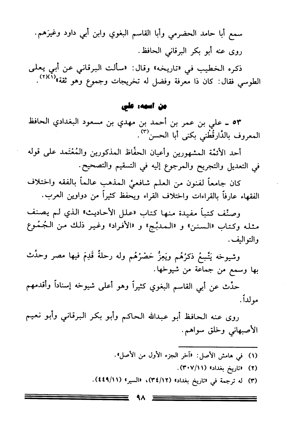 53- علي بن عمر بن أحمد بن مهدي بن مسعود البغدادي الحافظ المعروف بالدارقطني يكنى أبا الحسن.