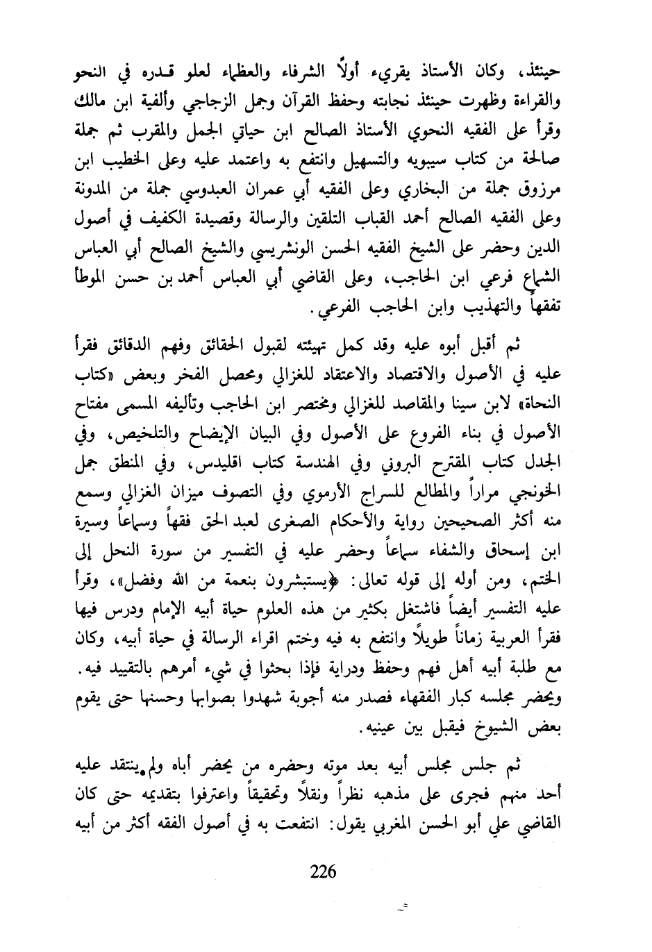 ثم أقبل أبوه عليه وقد كمل تهيئته لقبول الحقائق وفهم الدقائق فقرأ عليه في الأصول والاقتصاد والاعتقاد للغزالي ومحصل الفخر وبعض "كتاب النحاة" لابن سينا والمقاصد للغزالي ومختصر ابن الحاجب وتأليفه المسمى مفتاح الأصول في بناء الفروع على الأصول وفي البيان الإيضاح والتلخيص، وفي الجدل كتاب المقترح البروني وفي الهندسة كتاب اقليدس، وفي المنطق جمل الخونجي مرارًا والمطالع للسراج الأرموي وفي التصوف ميزان الغزالي وسمع منه أكثر الصحيحن رواية والأحكام الصغرى لعبد الحق فقهًا وسماعًا وسيرة ابن إسحاق والشفاء سماعًا وحضر عليه في التفسير من سورة النحل إلى الختم، ومن أوله إلى قوله تعالى: {يَسْتَبْشِرُونَ بِنِعْمَةٍ مِنَ اللَّهِ وَفَضْلٍ}، وقرأ عليه التفسير أيضًا فاشتغل بكثير من هذه العلوم حياة أبيه الإمام ودرس فيها فقرأ العربية زمانًا طويلًا وانتفع به فيه وختم اقراء الرسالة في حياة أبيه، وكان مع طلبة أبيه أهل فهم وحفظ ودراية فإذا بحثوا في شيء أمرهم بالتقييد فيه. ويحضر مجلسه كبار الفقهاء فصدر منه أجوبة شهدوا بصوابها وحسنها حتى يقوم بعض الشيوخ فيقبل بين عينيه.