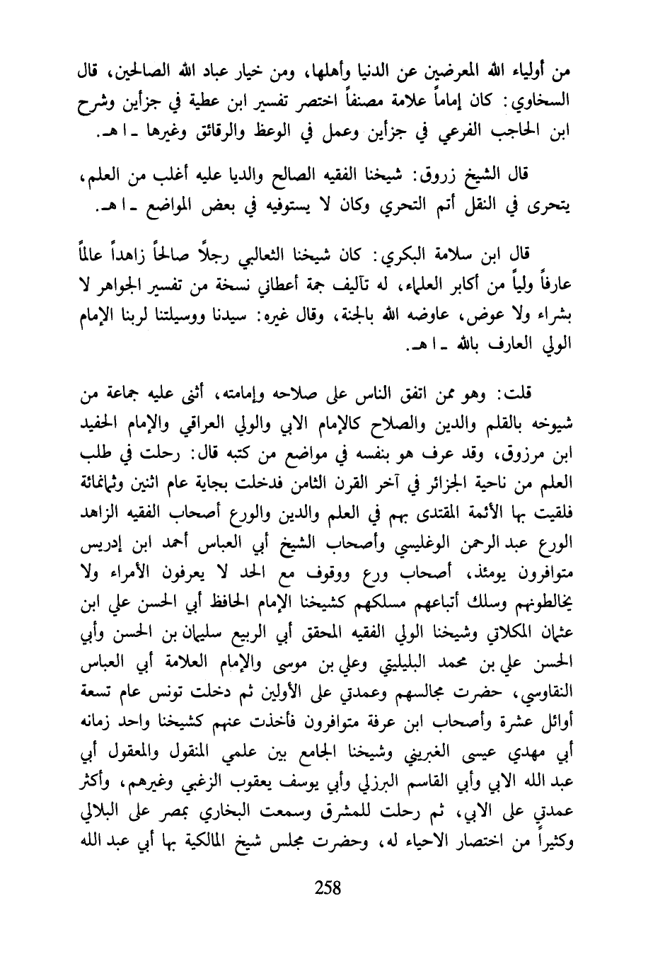 قلت: وهو ممن اتفق الناس على صلاحه وإمامته، أثنى عليه جماعة من شيوخه بالقلم والدين والصلاح كالإمام الابي والولي العراقي والإمام الحفيد ابن مرزوق، وقد عرف هو بنفسه في مواضع من كتبه قال: رحلت في طلب العلم من ناحية الجزائر في آخر القرن الثامن فدخلت بجاية عام اثنين وثمانمائة فلقيت بها الأئمة المقتدى بهم في العلم والدين والورع أصحاب الفقيه الزاهد الورع عبد الرحمن الوغليسي وأصحاب الشيخ أبي العباس أحمد ابن إدريس متوافرون يومئذ، أصحاب ورع ووقوف مع الحد لا يعرفون الأمراء ولا يخالطونهم وسلك أتباعهم مسلكهم كشيخنا الإمام الحافظ أبي الحسن علي ابن عثمان المكلاتي وشيخنا الولي الفقيه المحقق أبي الربيع سليمان بن الحسن وأبي الحسن علي بن محمد البليليتي وعلي بن موسى والإمام العلامة أبي العباس النقاوسي، حضرت مجالسهم وعمدتي على الأولين ثم دخلت تونس عام تسعة أوائل عشرة وأصحاب ابن عرفة متوافرون فأخذت عنهم كشيخنا واحد زمانه أبي مهدي عيسى الغبريني وشيخنا الجامع بين علمي المنقول والمعقول أبي عبد اللَّه الابي وأبي القاسم البرزلي وأبي يوسف يعقوب الزغبي وغيرهم، وأكثر عمدتي على الابي، ثم رحلت للمشرق وسمعت البخاري بمصر على البلالي وكثيرًا من اختصار الاحياء له، وحضرت مجلس شيخ المالكية بها أبي عبد اللَّه