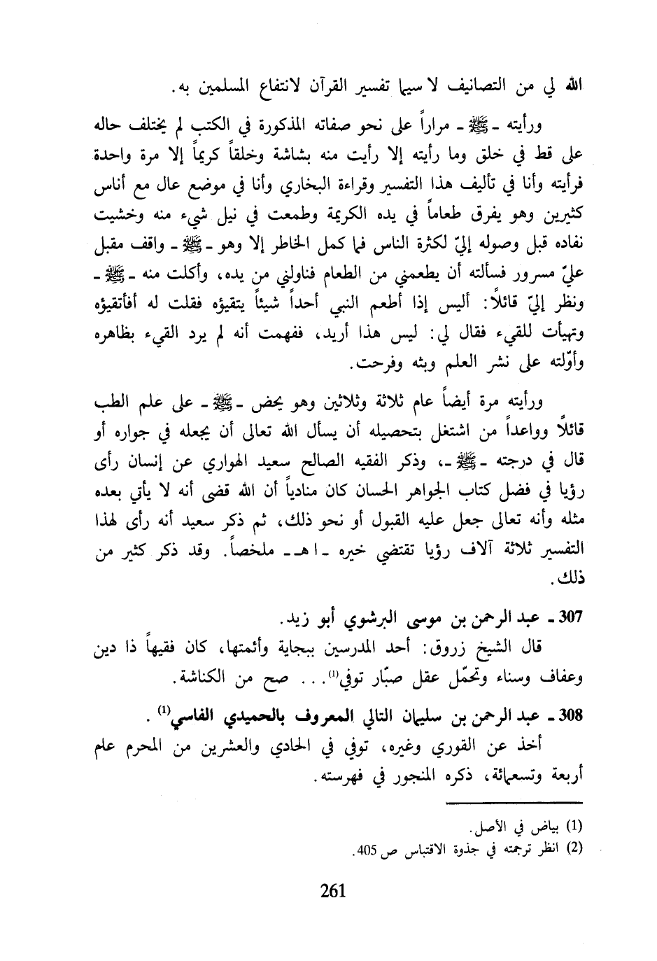 ورأيته -صلى اللَّه عليه وسلم- مرارًا على نحو صفاته المذكورة في الكتب لم يختلف حاله على قط في خلق وما رأيته إلا رأيت منه بشاشة وخلقًا كريمًا إلا مرة واحدة فرأيته وأنا في تأليف هذا التفسير وقراءة البخاري وأنا في موضع عال مع أناس كثيرين وهو يفرق طعامًا في يده الكريمة وطمعت في نيل شيء منه وخشيت نفاده قبل وصوله إليّ لكثرة الناس فما كمل الخاطر إلا وهو -صلى اللَّه عليه وسلم- واقف مقبل عليّ مسرور فسألته أن يطعمني من الطعام فناولني من يده، وأكلت منه -صلى اللَّه عليه وسلم- ونظر إليّ قائلًا: أليس إذا أطعم النبي أحدًا شيئًا يتقيؤه فقلت له أفأتقيؤه وتهيأت للقيء فقال لي: ليس هذا أريد، ففهمت أنه لم يرد القيء بظاهره وأوّلته على نشر العلم وبثه وفرحت.