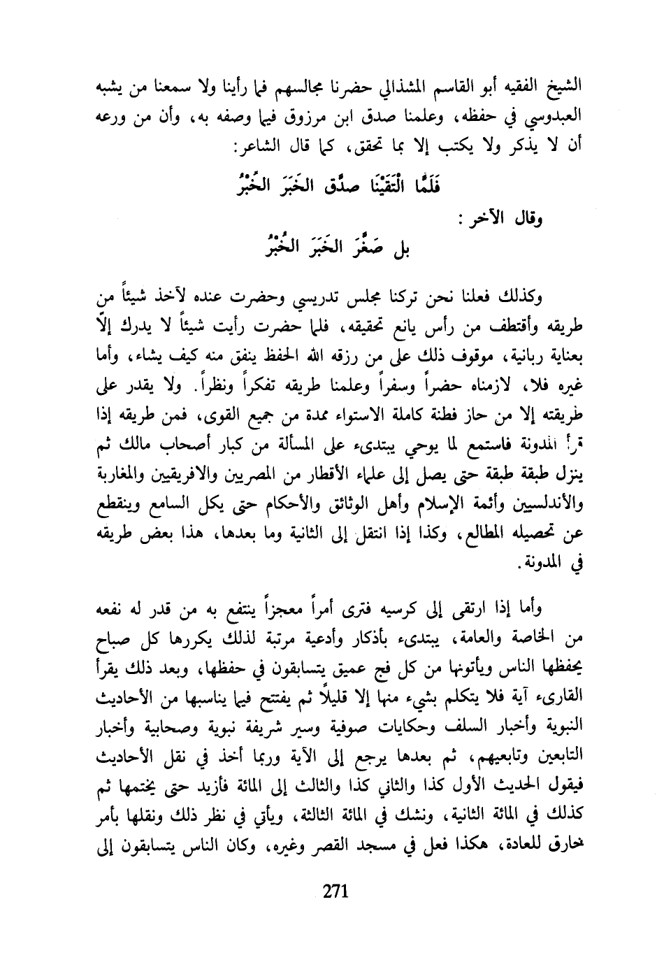 وكذلك فعلنا نحن تركنا مجلس تدريسي وحضرت عنده لآخذ شيئًا من طريقه وأقتطف من رأس يانع تحقيقه، فلما حضرت رأيت شيئًا لا يدرك إلّا بعناية ربانية، موقوف ذلك على من رزقه اللَّه الحفظ ينفق منه كيف يشاء، وأما غيره فلا، لازمناه حضرًا وسفرًا وعلمنا طريقه تفكرًا ونظرًا. ولا يقدر على طريقته إلا من حاز فطنة كاملة الاستواء ممدة من جميع القوى، فمن طريقه إذا قرأ المدونة فاستمع لما يوحي يبتدئ على المسألة من كبار أصحاب مالك ثم ينزل طبقة طبقة حتى يصل إلى علماء الأقطار من المصريين والافريقيين والمغاربة والأندلسيين وأئمة الإسلام وأهل الوثائق والأحكام حتى يكل السامع وينقطع عن تحصيله المطالع، وكذا إذا انتقل إلى الثانية وما بعدها، هذا بعض طريقه في المدونة.